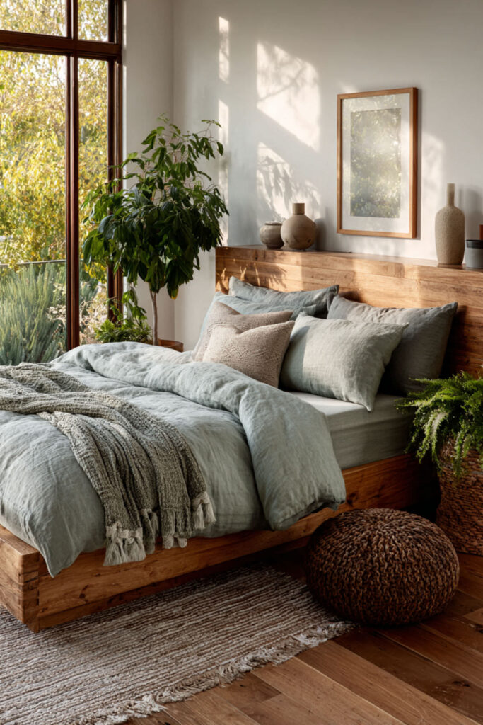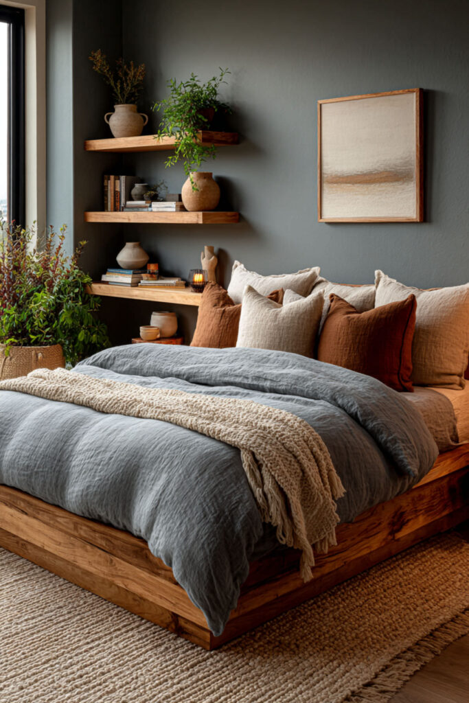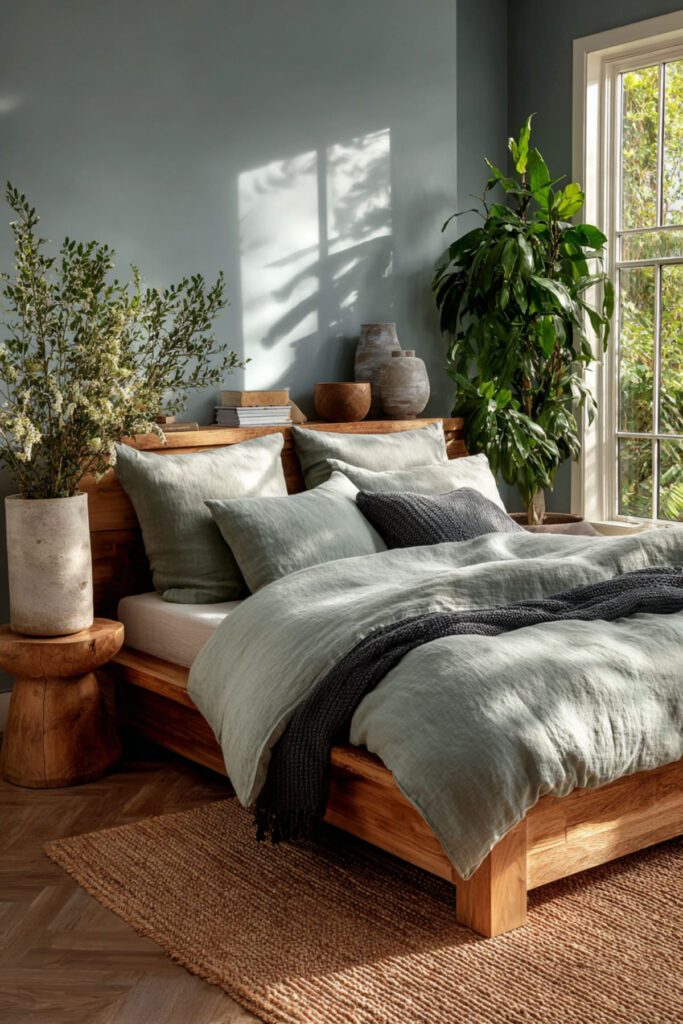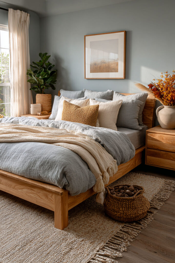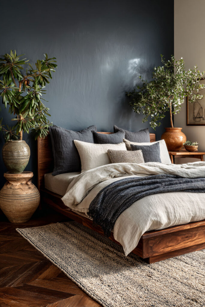 Japandi Bedroom with Earthy Blues and Natural Textures
