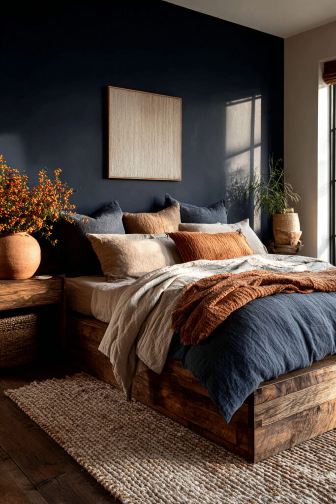 Okay, I used to think navy was too formal for a bedroom — too “nautical theme gone wrong.” But pair it with warm earth tones like beige, camel, and sand? It’s a completely different story. A navy accent wall behind the bed with beige linen bedding, a woven jute throw, and maybe a clay-colored lamp on the nightstand creates something that feels grounded and quietly bold at the same time. The navy provides depth while the earth tones soften everything around it. I strongly recommend a textured beige linen duvet cover — the natural wrinkles in linen give the bed that effortless, lived-in quality that organic modern is all about. This navy and earth tone bedroom idea works especially well in rooms that get good natural light, because the sun warms up the navy and makes the beige glow.