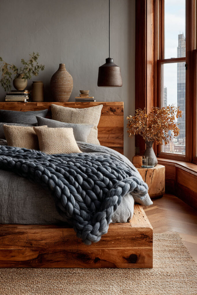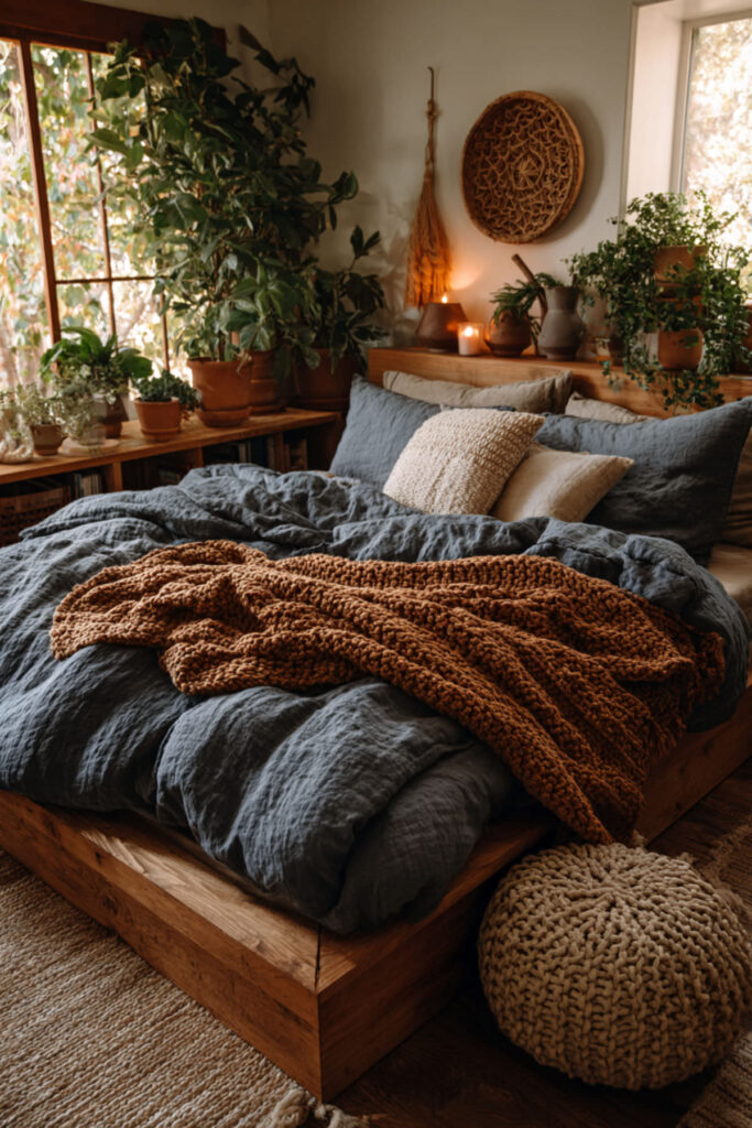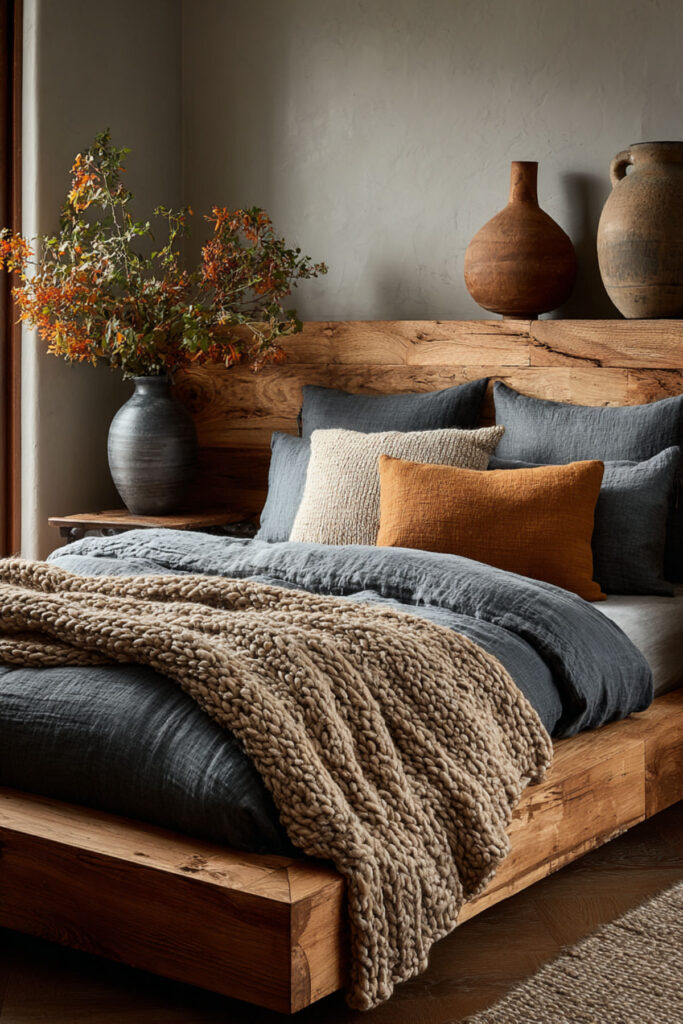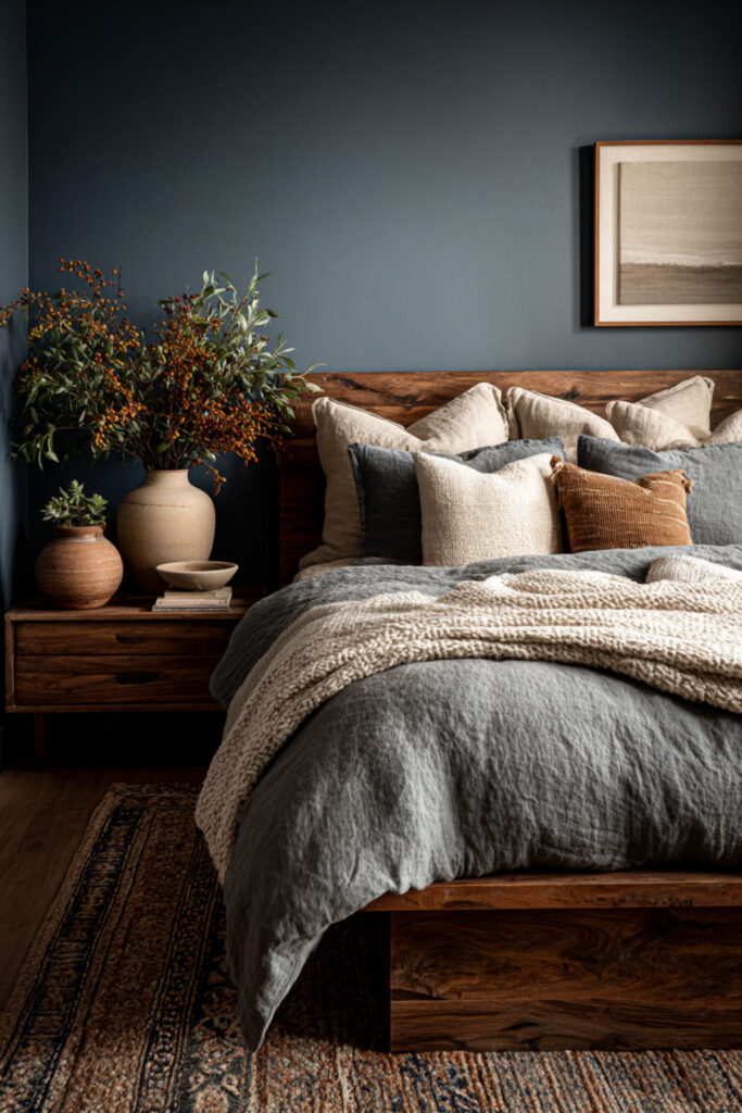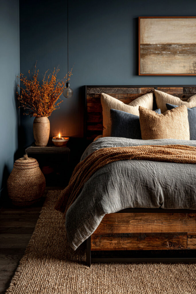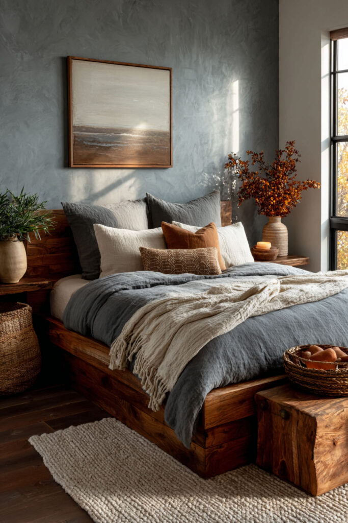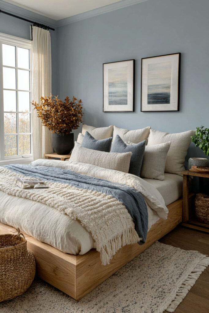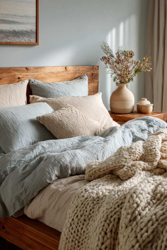Hygge Bedroom with Cozy Blue and Earthy Textiles
