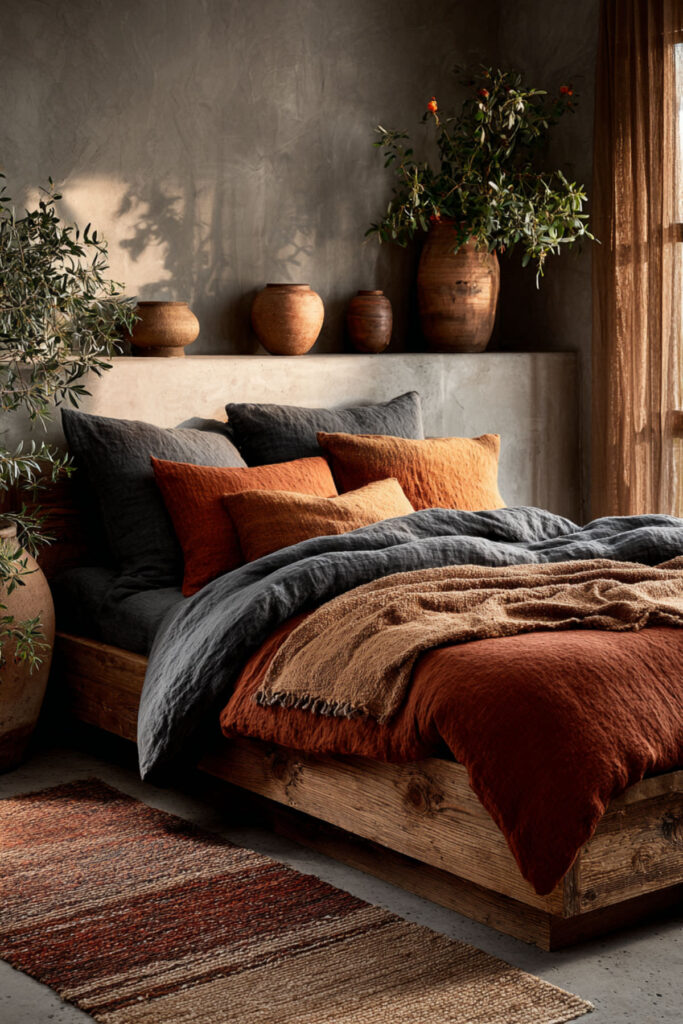 If you’re someone who loves color but hates anything that feels loud, muted tones are your best friend. Slate blue walls — that beautiful midpoint between blue and gray — paired with warm sand and camel tones creates a palette that whispers rather than shouts. Everything in this room should feel dialed back and intentional: a sand-colored linen headboard, a soft throw in warm wheat, ceramic pieces in tan and cream. This is the organic modern approach to muted bedroom colors — where every shade has been pulled from a real place in nature. I recommend a linen upholstered headboard in a warm sand or oatmeal tone — it softens the slate blue wall behind it and makes the bed feel like a warm island in a cool room. This bedroom palette works especially well in rooms that face north or east, where the light is naturally cooler.