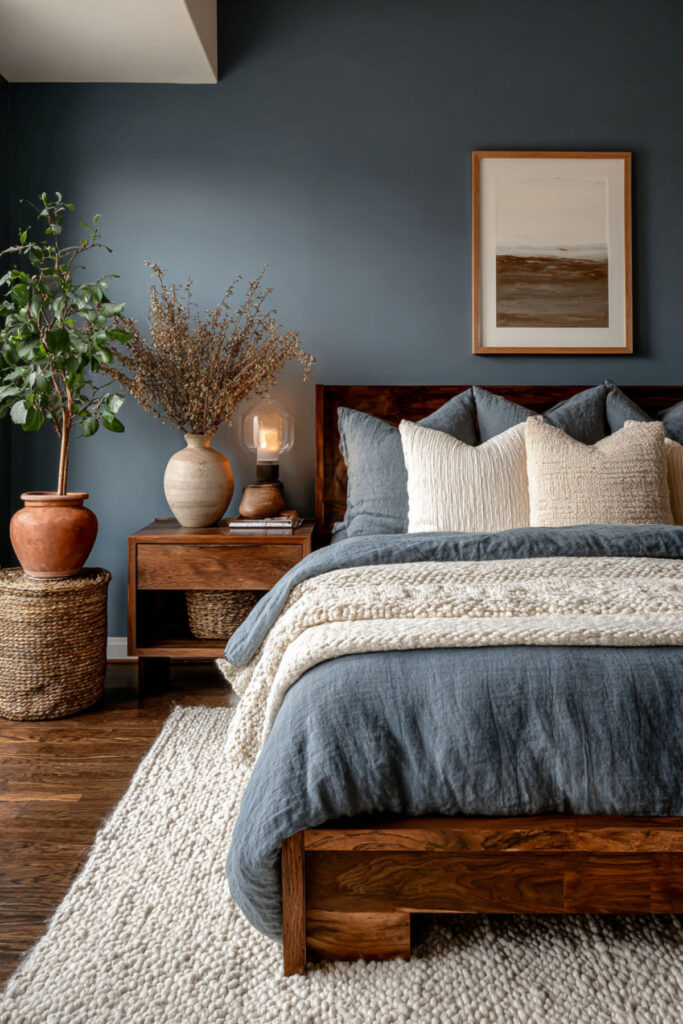 Dark Blue and Neutral Bedroom with an Organic Edge