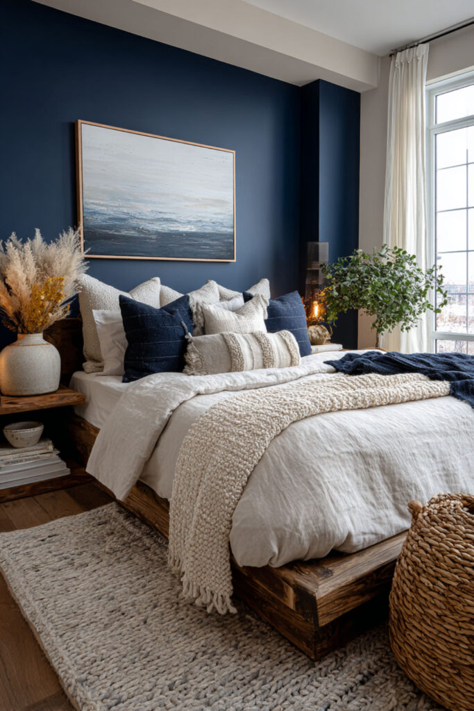 For the woman who wants drama without sacrificing calm, a dark blue wall — think deep indigo or inky navy — balanced with soft neutrals and organic textures is incredibly striking. The darkness of the blue creates an enveloping, restful quality, while creamy bedding, a light wood nightstand, and a woven rug keep it from feeling heavy. The key is ratio: the dark blue takes up one surface (ideally the wall behind the bed) while everything else stays light and warm. I strongly recommend a cream or ivory wool throw to drape across the bed — against dark blue, it pops in the most beautiful way. This dark blue and neutral bedroom has a modern navy blue bedroom vibe but with that unmistakable organic modern softness that makes it feel livable, not staged.