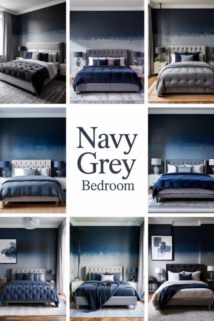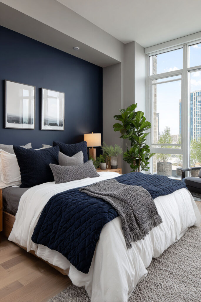Keep walls soft grey and use white bedding as your base, adding navy through throws, pillows, and art. This creates a fresh, changeable foundation.