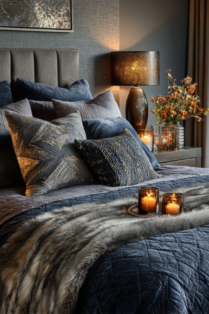 Layer bedding to create depth: steel grey sheets, navy duvet, blue-grey throw, and charcoal accent pillows. Mix textures – matte cotton, shimmery silk, nubby linen – like combining matte and glossy nail finishes.