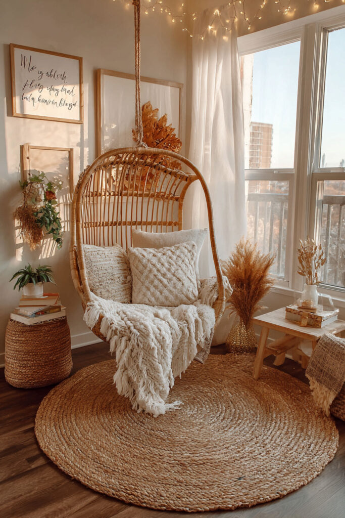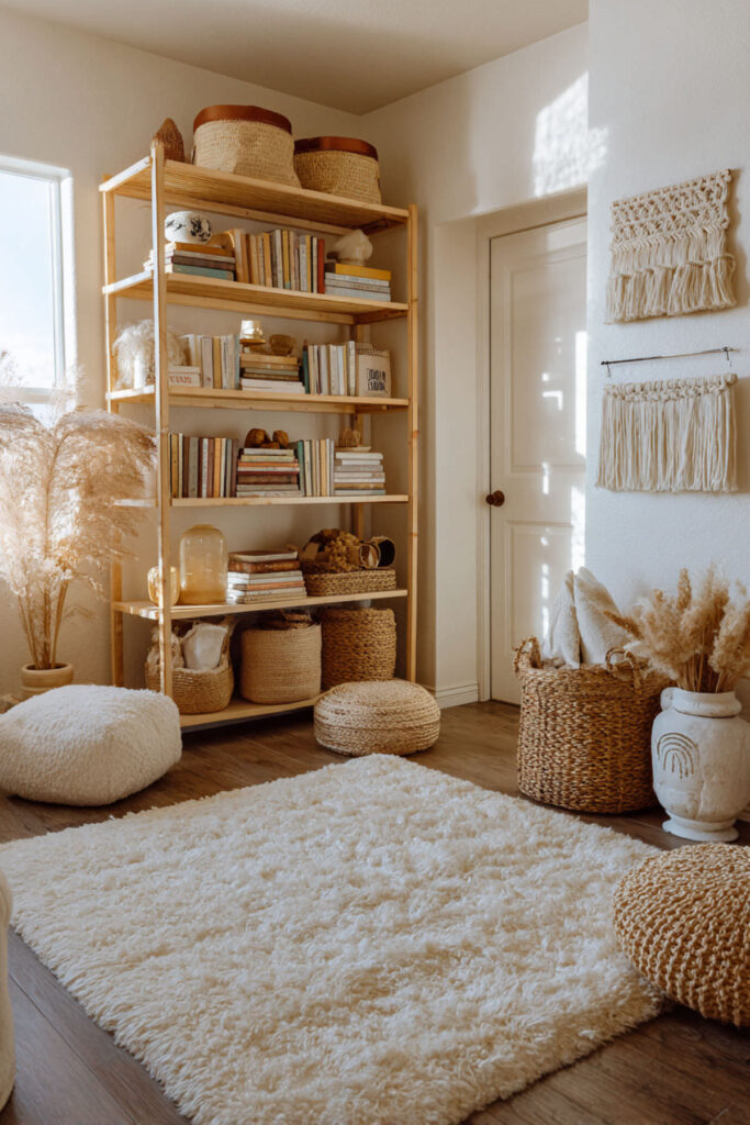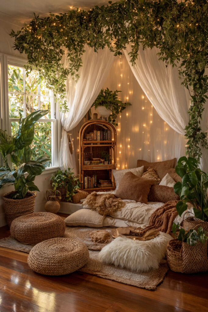 A boho reading nook can nurture future scholars without feeling like a library. You can create a tent-like corner with flowing fabrics, add floor cushions in warm earth tones, and install floating bookshelves arranged artistically. String lights provide ambiance while a quality reading lamp ensures proper lighting. This cozy reading nook makes learning feel like an adventure rather than obligation.