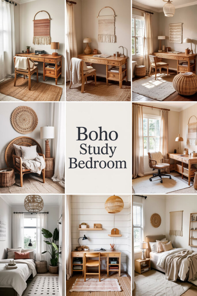 Design study areas that boost productivity while maintaining boho calm. Choose a natural wood desk, add a pegboard covered in woven fabric for organization, and incorporate plants known to improve concentration. The key is creating an inspiring workspace that doesn’t feel corporate. Woven baskets hold supplies while maintaining aesthetic flow. This study area proves focus and free-spirit aren’t mutually exclusive.
