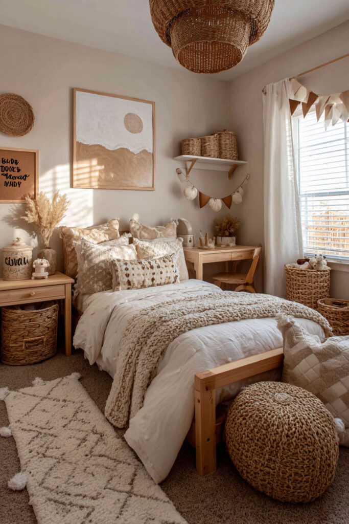 Design a stylish kids room that grows with increasing sophistication. Choose boho elements that translate from childhood through teens – quality textiles, natural wood furniture, and artistic wall treatments. The style evolution happens through accessory changes, not complete overhauls. This approach respects both current age and future growth.