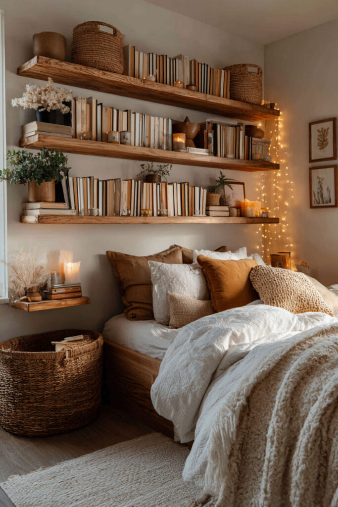 Transform book organization into boho art that celebrates learning. Create a rainbow book display on floating shelves, add trailing plants between book sections, and incorporate vintage bookends found at flea markets. This artistic approach makes books the room’s jewelry. The visible library encourages reading naturally. This method works for building home libraries intentionally.
