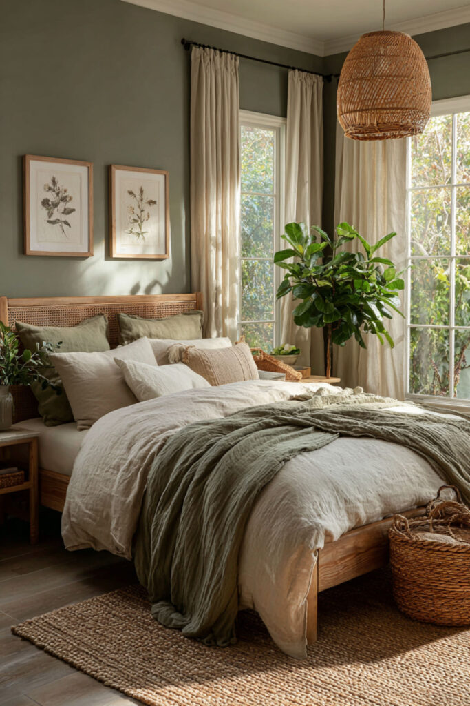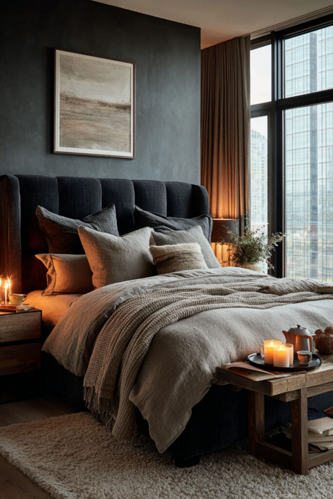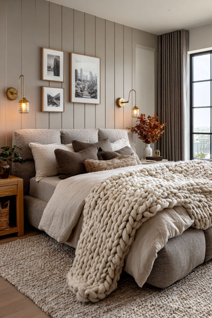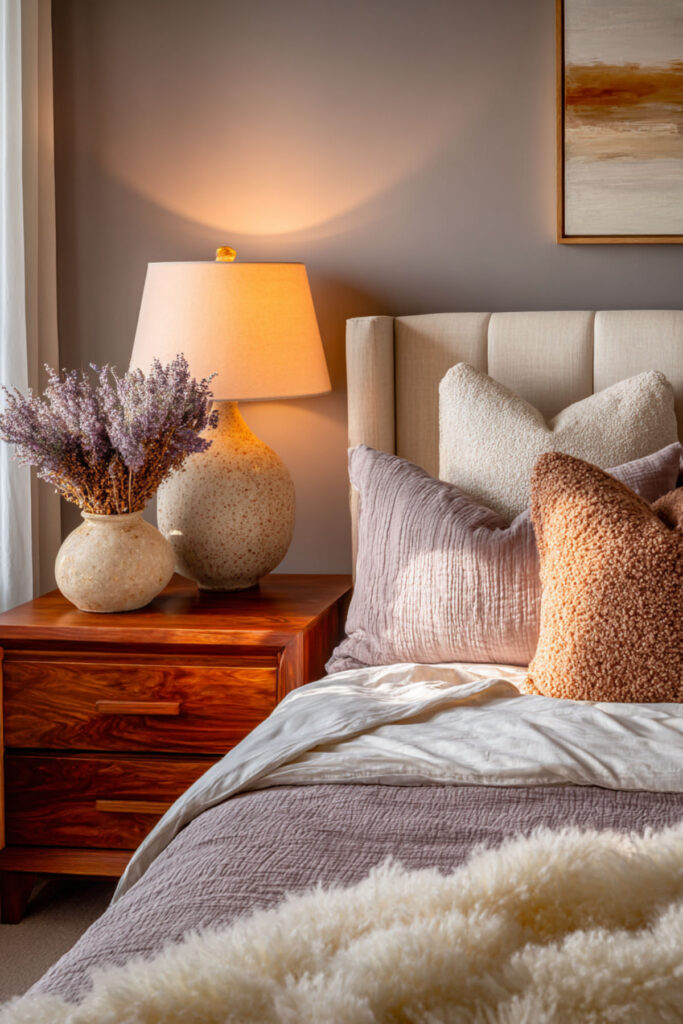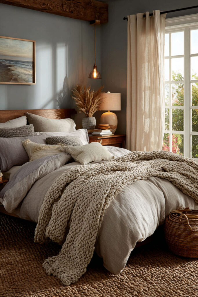 Paint color is just the beginning – the real magic happens when you layer in calming bedroom decor cozy elements. Think soft, touchable textures in complementary neutral tones. I’ve become obsessed with adding multiple light sources at different heights – table lamps, sconces, even bat