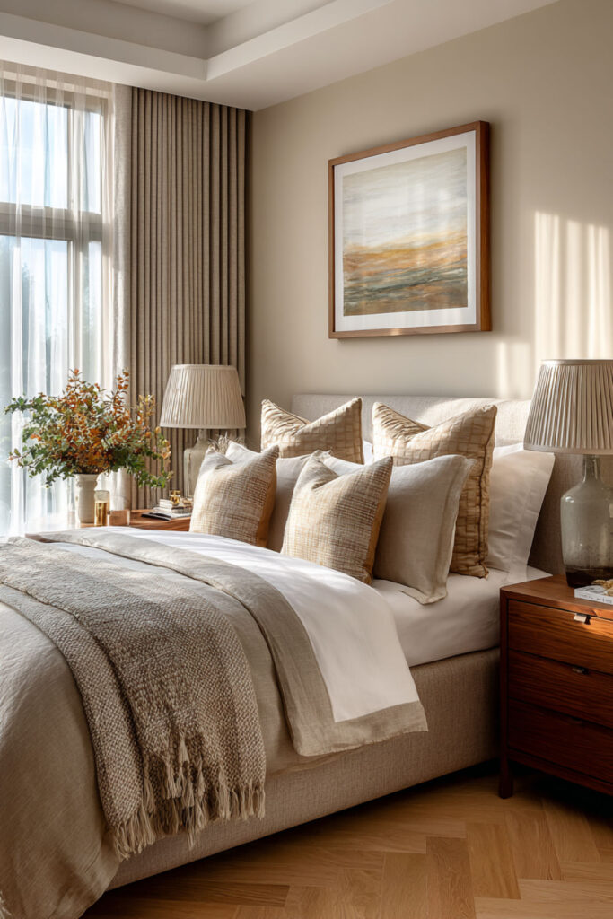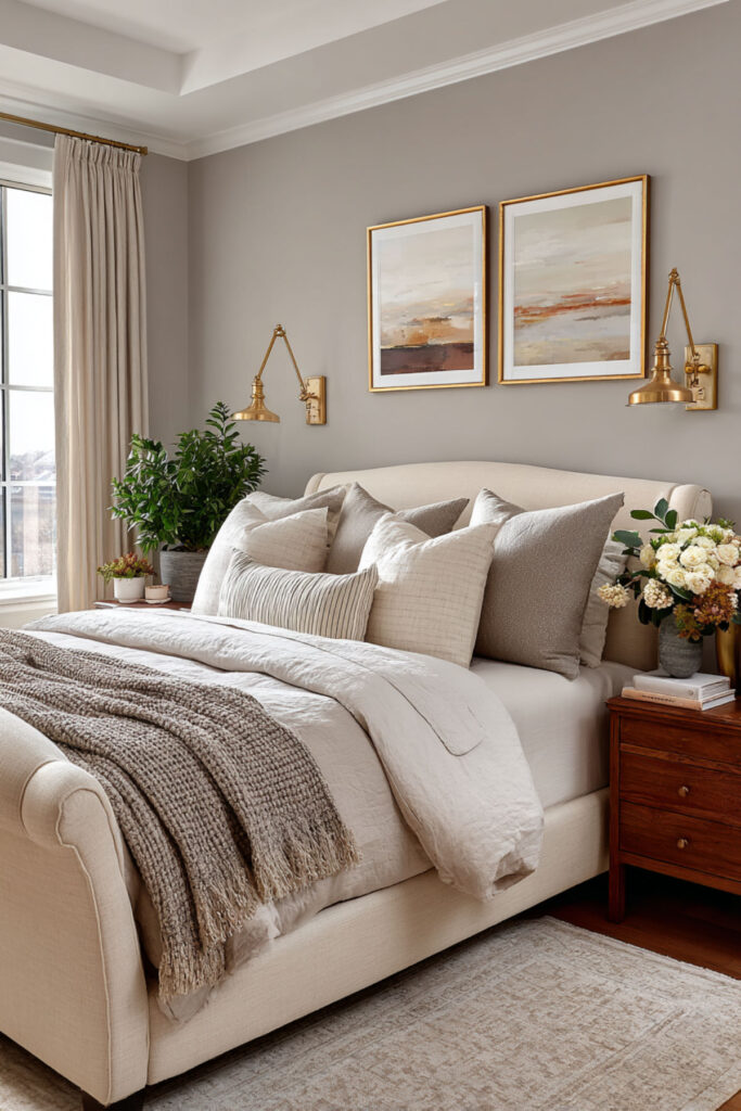 When in doubt, go neutral – but make it interesting. The best neutral paint bedroom ideas for women in our age group involve layering different shades of the same color family. Start with a warm greige (gray-beige) base, then add depth with darker accents on one wall or through textiles.