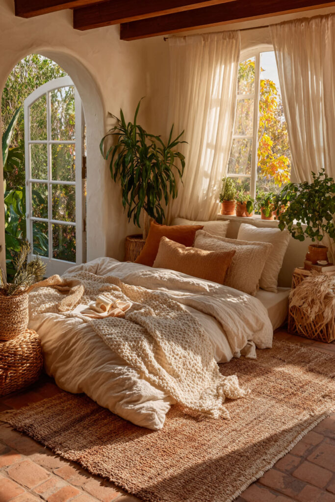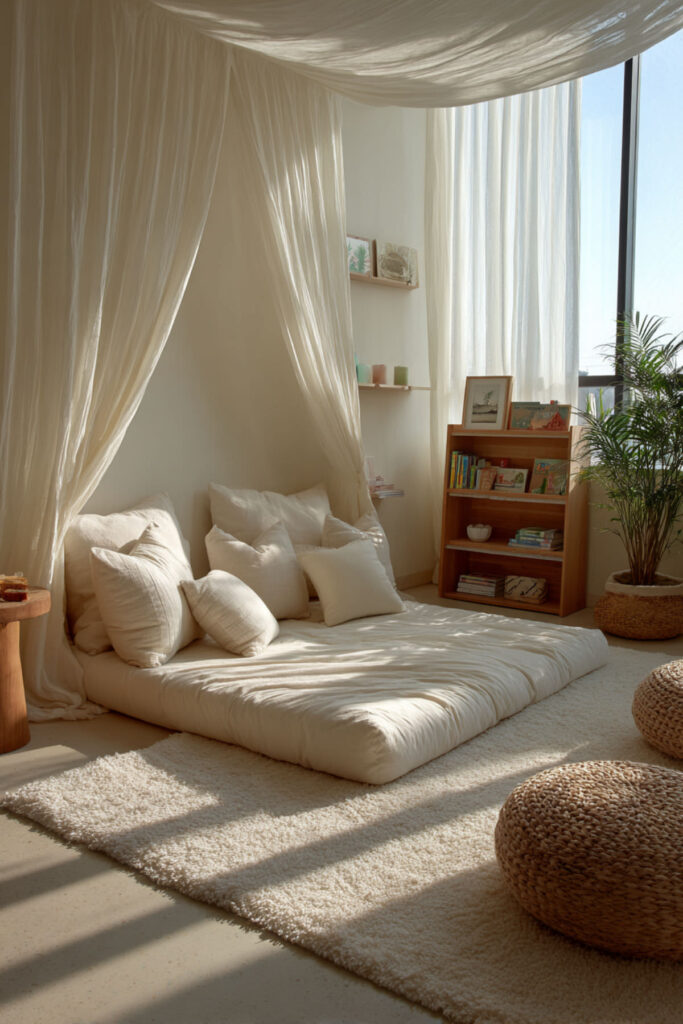 I recommend this type of floor cushion arrangement for comfortable seating that toddlers can rearrange. The boho vibe encourages relaxation and free-spirited play within boundaries. Ever since embracing boho, your bedroom should feel like a creative retreat rather than just a sleeping space.