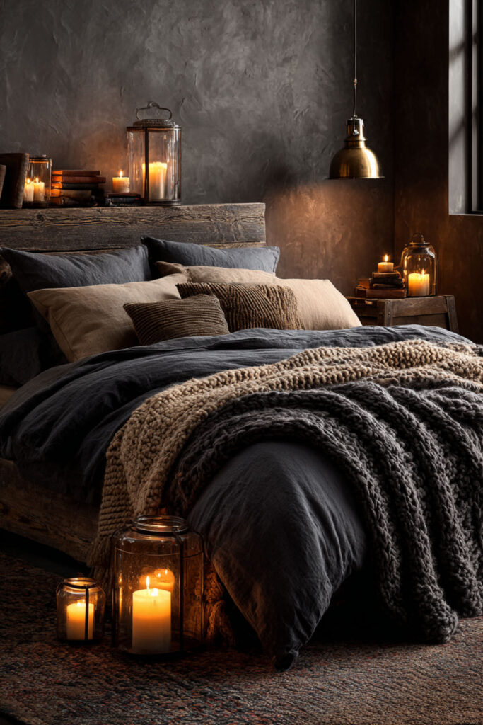 Romantic bedroom ideas aren’t just for couples — they’re for anyone who wants their room to feel special. In a dark moody bedroom, candlelight creates soft shadows that move across deep walls in a way that feels alive and intimate. I recommend beeswax or soy candles on both nightstands and the dresser — the amber glow against charcoal or midnight walls is extraordinary. Room bedding in cream or warm white against dark walls catches candlelight beautifully. A warm bedroom filled with soft light is the kind of room where journaling feels less like a task and more like a conversation with yourself.