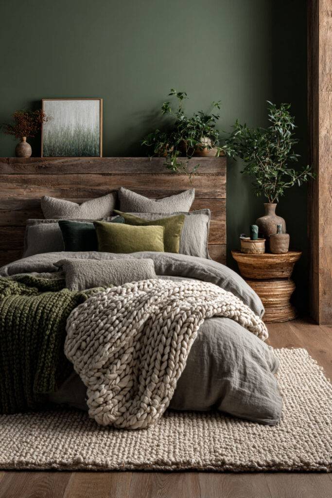 Green bedroom ideas in the dark family — deep forest, rich olive, dark sage — bring the outdoors into a moody palette. I recommend forest green on the walls with cream bedding, warm walnut furniture, and brass accents. Green promotes calm and emotional balance, which supports reflective thinking and journaling. Bedroom design trends in 2026 consistently feature dark green as a primary alternative to grey and blue. Primary bedroom ideas and main bedroom ideas in the deep green family create a retreat that feels both grounded and alive.