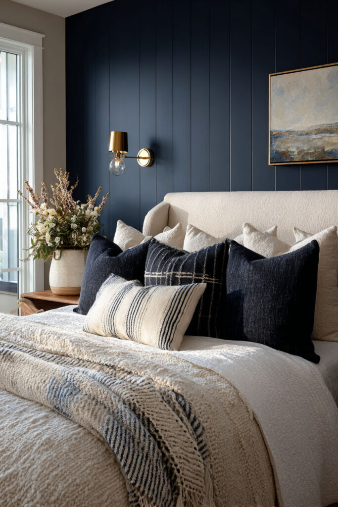 If painting all four walls dark feels like too much, a bedroom accent wall creates depth without overwhelming the room. Bedroom accent wall ideas in the dark family work best on the wall behind the bed — it frames the bed as the focal point and creates a dramatic backdrop for lighter bedding. I recommend a deep charcoal, rich olive, or midnight blue on the accent wall with warm cream or greige on the remaining three. Accent wall bedroom approaches create visual depth that makes the room feel larger, not smaller. This is also a great approach for an affordable bedroom makeover — one wall of paint creates maximum impact for minimal cost.