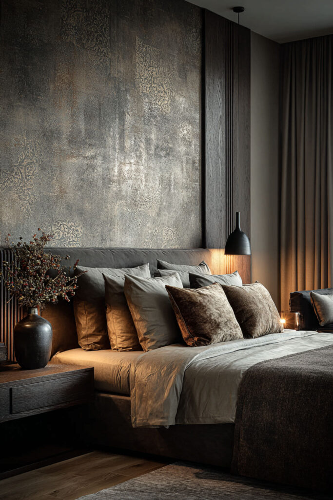 I used to think wallpaper in a dark room would feel overwhelming. I’ve completely changed my mind. Bedroom wallpaper ideas in the moody family — a subtle damask in charcoal on charcoal, a linen-texture wallpaper in deep olive, a tone-on-tone botanical in midnight — add dimension that paint alone can’t achieve. I recommend wallpaper on the accent wall behind the bed paired with matching paint on the remaining walls. The texture catches light differently throughout the day, which gives a dark room visual movement. Decorating bedroom with wallpaper and room decorating with textured surfaces are both trending heavily into 2026.