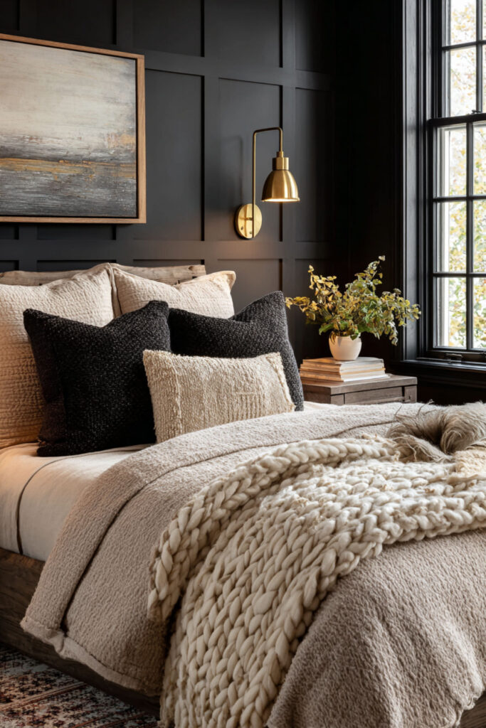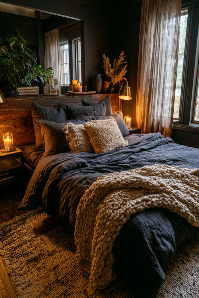 Next up — cozy bedroom ideas built on texture. A dark moody bedroom needs layers to keep it from feeling flat or cold. I recommend velvet throw pillows, a chunky knit blanket, linen sheets, and a soft wool rug underfoot. Cosy bedroom ideas in the dark family prioritize how the room feels against your skin. Cozy aesthetic bedroom decor, bedroom decor cozy, and cozy bedroom rooms are the searches that drive the most saves on Pinterest. A cozy space and a cozy room become a cozy bedroom when every surface invites touch. Styled bed and style a bed approaches in the dark moody family layer cream and warm grey bedding against deep walls for contrast that feels rich.