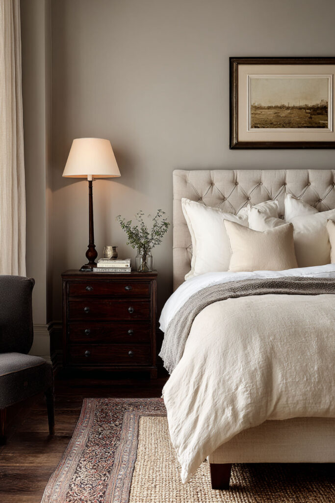 Dark moody works across every design style. Minimalist bedroom ideas in the dark family use fewer objects and let the walls and light do the work — a clean bed, one lamp per side, one piece of art. Boho bedroom ideas in the dark family layer textiles, plants, and warm metals against deep walls for a collected, lived-in look. Rustic bedroom ideas add reclaimed wood, vintage quilts, and imperfect textures. All three styles — minimalist, boho, rustic — prove that dark moody isn’t one aesthetic. It’s a mood. Modern vintage bedrooms and vintage bedroom decor in the dark family mix old and new beautifully.