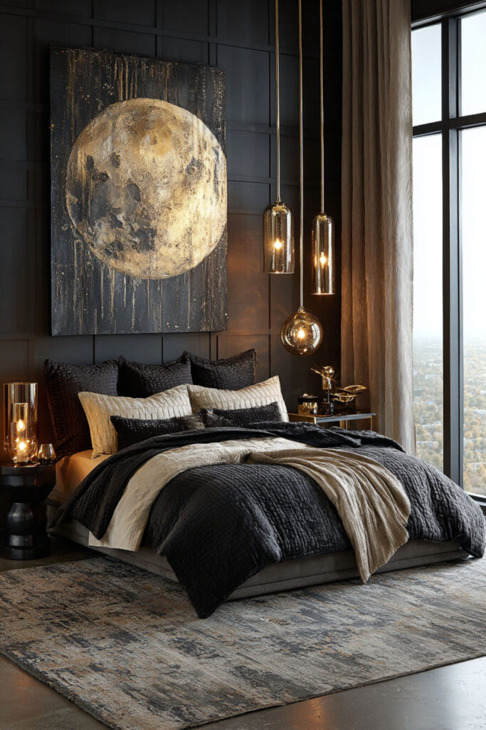 Elegant Bedroom Ideas with Metallic Moon Art
