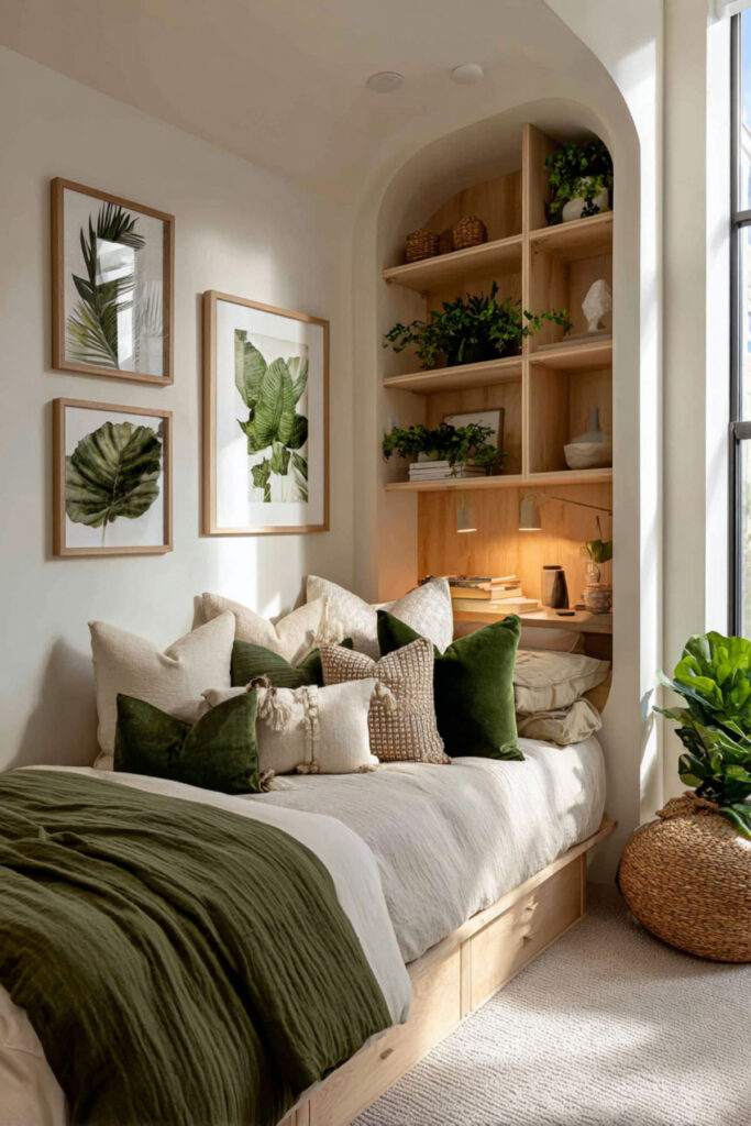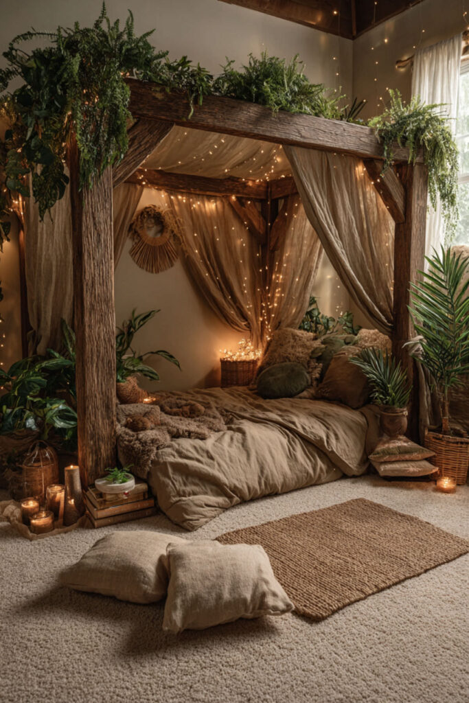 This woodsy bedroom decor works especially well for nature-loving families. I really recommend this approach for creating wonder without screens. Include found natural treasures from family walks. Would you bring the forest indoors? The effect is magical and grounding simultaneously.