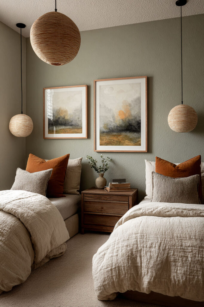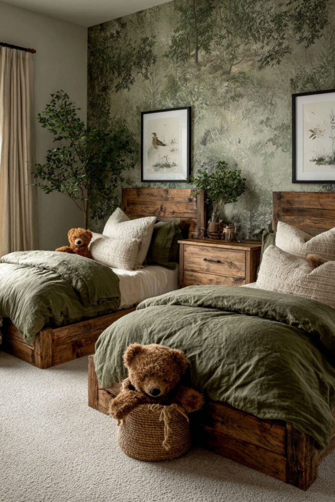 Creating an earthy kids bedroom starts with a grounding color palette inspired by nature. Consider painting the walls in Farrow & Ball’s “Green Ground” – a soft sage that changes with natural light throughout the day. Layer in warm terracottas, soft sand tones, and deep forest greens through textiles and accessories. These earthy bedroom colors instantly calm overstimulated nervous systems. The natural palette provides visual rest from the bright, artificial colors of screens and plastic toys.