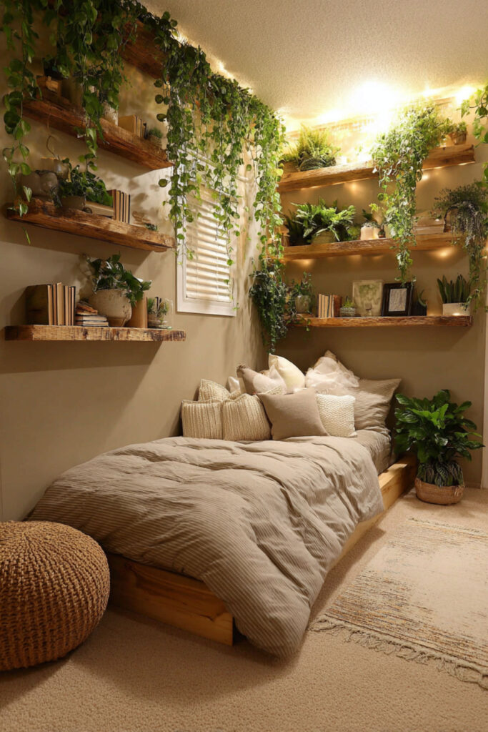 Choose hardy varieties that survive occasional neglect. This green room inspiration teaches responsibility while purifying air. I recommend this type of wall-mounted planter system for safety and visual impact. The living elements make the room feel alive without electricity. Since adding plants, your daughter spends morning time watering and talking to her “green friends” instead of asking for cartoons.