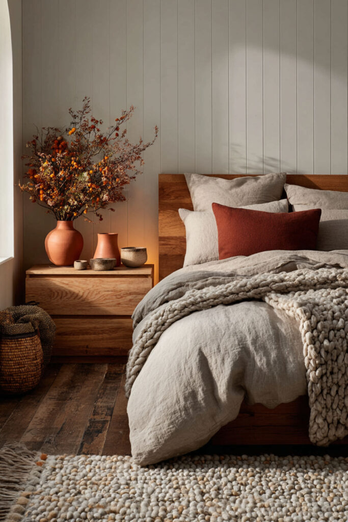 Expand into earth tone bedroom palettes anchored by taupe for natural rhythm support. Consider adding warm terracotta and soft sage to your taupe base, creating nature’s sleep palette. A sage green accent chair complements the earthy mix and provides a cozy seating area for unwinding. Earth tones reconnect you to natural sleep-wake cycles disrupted by modern life.