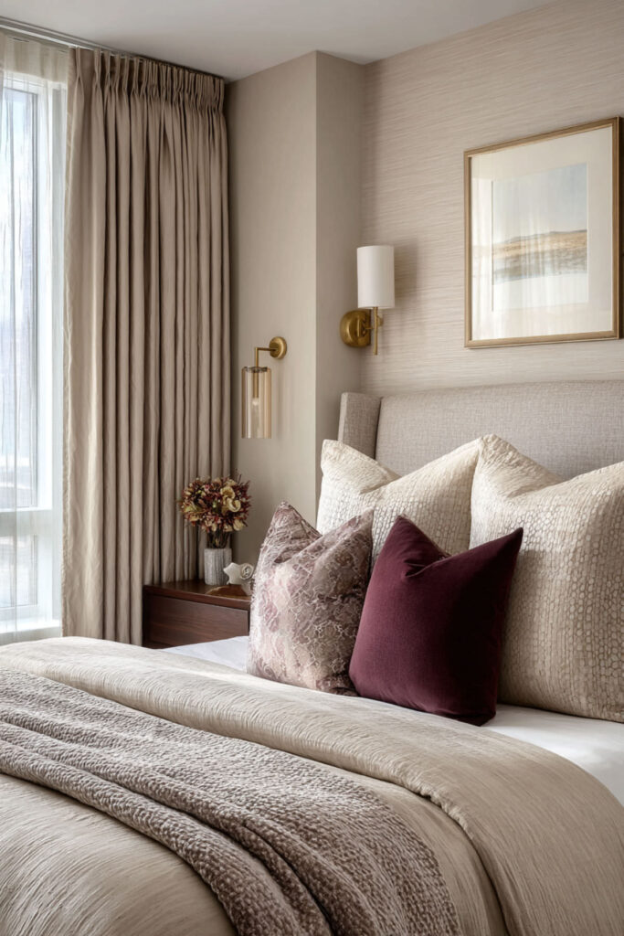 Combine dusty plum and taupe bedroom elements for sophisticated sedation that doesn’t feel medicinal. Consider painting three walls in taupe and one accent wall in dusty plum – Benjamin Moore’s “Vintage Charm.” This combination creates depth without drama, perfect for sensitive sleepers. The plum adds just enough interest to prevent monotony while maintaining calm.