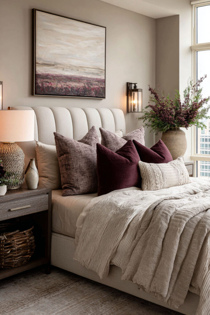 The color provides visual interest without mental stimulation. I really recommend strategic plum placement. Would you add complex color thoughtfully? The plum accents can make your bedroom feel intentionally restful.