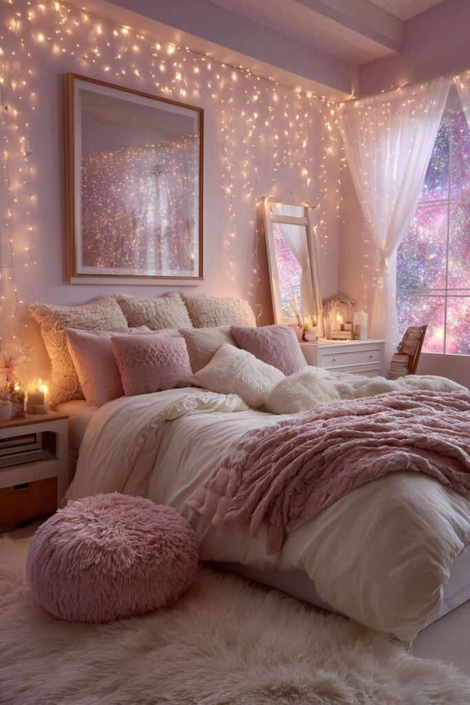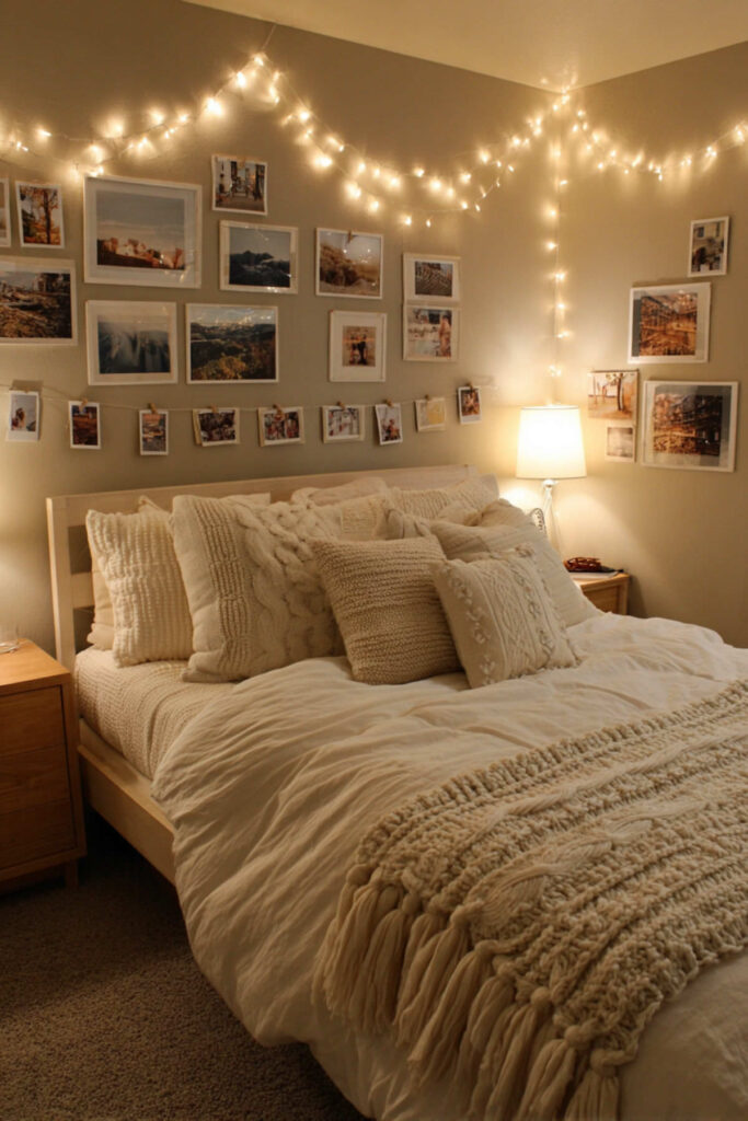 Running fairy lights across your ceiling — either in straight lines from wall to wall or in a loose, scattered pattern — turns the overhead space into a glowing canopy that makes the room feel like you’re sleeping under stars. This is the setup that creates the most immersive cozy night aesthetic because the light is above you, wrapping down from every direction. The effect is especially beautiful when you’re lying in bed looking up. I strongly recommend warm white micro LED fairy lights (the tiny copper wire kind, not the large bulb kind) draped in loose rows across the ceiling, attached with small clear Command hooks spaced about 12 inches apart. Use multiple strands to fill the space. This fairy lights bedroom ceiling and fairy lights on ceiling idea is the most dramatic single change you can make to a room — from normal bedroom to glowing night sanctuary in about twenty minutes.