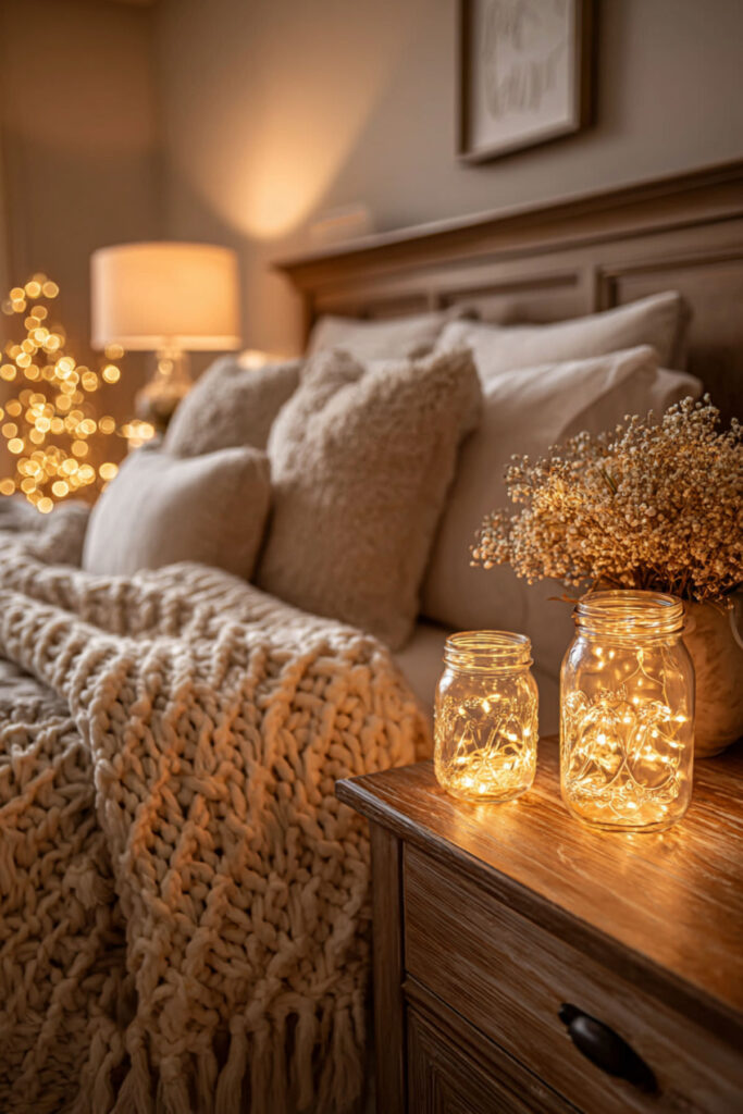 Sometimes you don’t want fairy lights everywhere — you just want a single, self-contained glow sitting on your nightstand or shelf like a little lantern. Coiling a short strand of micro LED fairy lights inside a mason jar (or any clear glass jar) creates a warm, glowing object that looks handmade and nostalgic — like a jar full of fireflies. It’s the simplest fairy light project on this list and it takes about thirty seconds to do. I recommend a short strand of battery-operated warm white micro LED fairy lights coiled loosely inside a clean mason jar or vintage glass jar — leave the lid off or loosely set it on top. Place it on a nightstand, a shelf, or a windowsill. Make two or three for a grouped display. This fairy lights decoration ideas concept is the project for the night you want to do something creative but only have five minutes and zero energy.