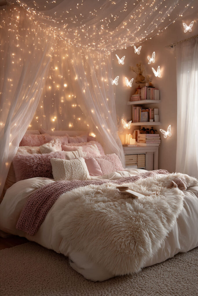 Butterfly fairy lights — where each LED is attached to a small translucent butterfly shape — add a delicate, almost magical quality to any room. The butterflies catch the light and cast soft, winged shadows on the wall, creating movement and dimension that standard fairy lights can’t produce. Pink butterfly fairy lights lean coquette and soft girl; gold butterflies feel more elegant and vintage; clear or white butterflies work with almost any aesthetic. I recommend butterfly-shaped fairy lights in either pink, gold, or warm white — drape them along a wall, weave them through a shelf display, or combine them with ivy garlands for a layered look. This pink butterfly fairy lights and gold butterfly fairy lights idea is for the girl whose room is an extension of who she is — soft, detailed, and a little bit dreamy.
