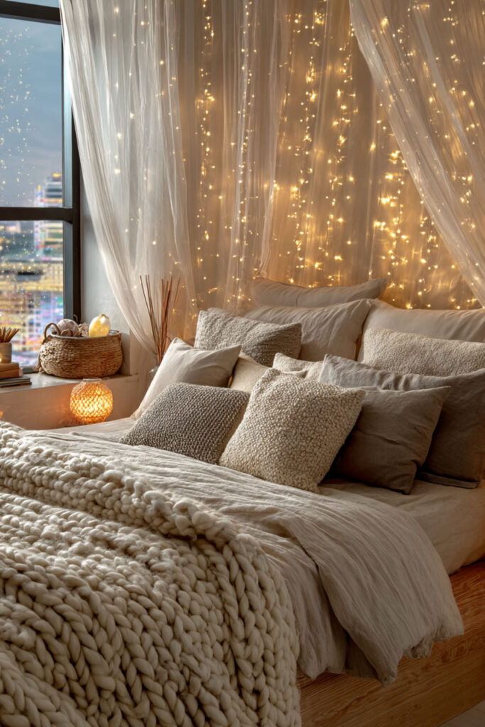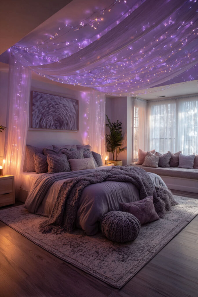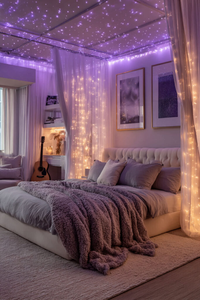 A fairy light canopy combines sheer fabric (tulle, chiffon, or mosquito netting) with fairy lights draped over and through the fabric, creating a glowing tent over your bed that is peak cozy night aesthetic. The fabric softens and diffuses the light, the structure creates a sense of enclosure and safety, and the overall effect is somewhere between a fairy tale and the coziest fort you’ve ever built. I strongly recommend hanging a sheer canopy (white or cream tulle or netting) from the ceiling above your bed using a hook or hoop, then weaving warm white micro LED fairy lights through the fabric. Twist the lights into the folds so they glow from within the fabric rather than sitting on top. This fairy light canopy bedroom and curtains on ceiling with lights idea is the setup that makes bedtime feel like an event — not because it’s complicated, but because it’s beautiful.