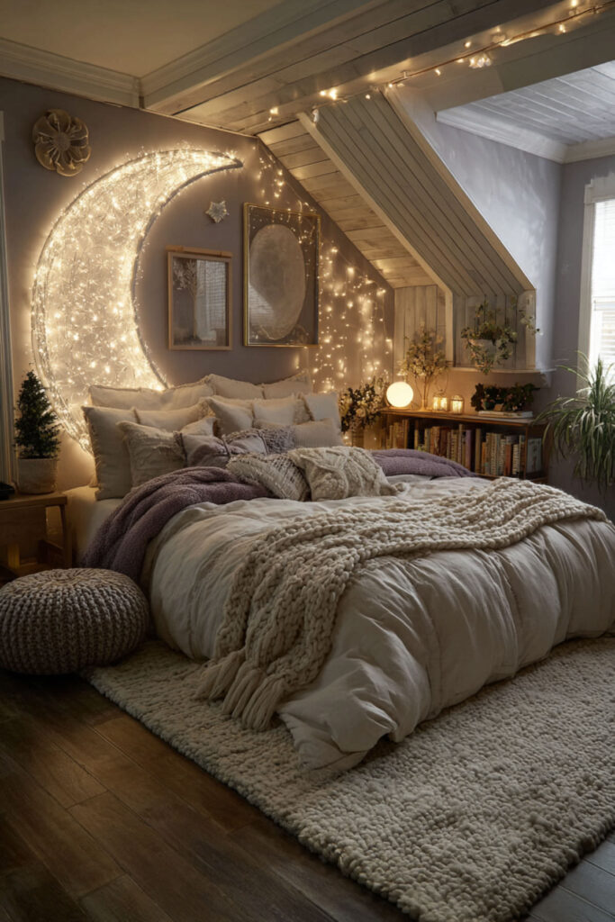 A moon-shaped fairy light — either a crescent or full moon shape made from LED wire or a flat LED panel — becomes a wall-mounted nightlight that doubles as art. It glows softly, casts a warm light in a single direction, and adds a celestial element to the room that connects to the whole cozy night aesthetic on a thematic level. I strongly recommend a crescent moon LED wall light in warm white — mount it above the bed, beside a window, or above a shelf. Pair it with star fairy lights nearby for a full night-sky vignette. This moon-shaped fairy lights on wall idea is the statement piece for the girl whose room aesthetic is built around nighttime — because the moon doesn’t just light the room, it names the vibe.