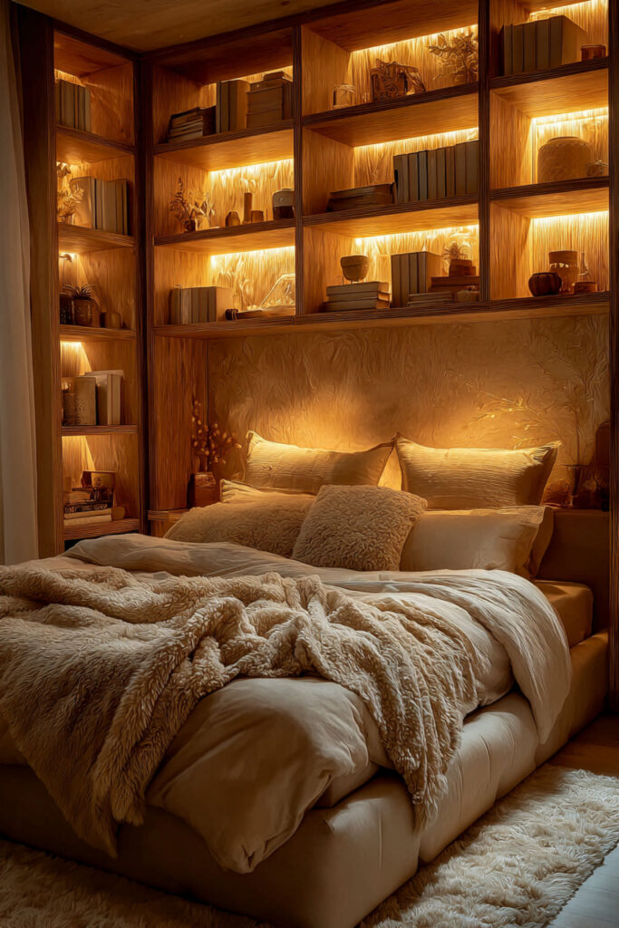 Weaving fairy lights through a bookshelf — along the back wall of each shelf, across the top, or draped loosely between books and decor objects — turns a regular shelf into a glowing display case. The light highlights whatever you’ve curated (books, candles, small plants, figurines, photos) and adds depth and warmth to the entire wall. It’s practical and aesthetic at the same time: you can actually see your shelf contents at night, and the glow spills into the room as ambient light. I recommend warm white micro LED fairy lights threaded along the back of each shelf from top to bottom — use one continuous strand and weave it back and forth between shelves. This fairy lights bedroom and indoor string lights idea is the setup for girls who’ve already styled their shelf beautifully and now want it to glow.
