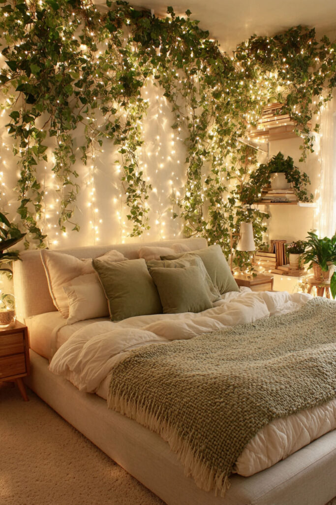 Wrapping fairy lights around faux ivy vines — or buying pre-made ivy garlands with built-in LEDs — creates a look that’s part enchanted garden, part cozy bedroom, and entirely magical. The green leaves add color and organic texture, and the tiny lights peeking through the leaves produce a dappled, forest-like glow that changes the whole feeling of a wall. Drape them along the top of a wall, around a window frame, along a shelf edge, or above the bed. I recommend faux ivy garlands with built-in warm white LED fairy lights — most come in 6 to 8 foot lengths, so you’ll want two to three strands to cover a full wall or window area. Attach with small clear hooks or clips. This ivy with led lights and vine wall with fairy lights and light up ivy garland idea is the fairy light setup that makes your room feel like a secret garden you accidentally wandered into — and honestly, that’s the entire energy.