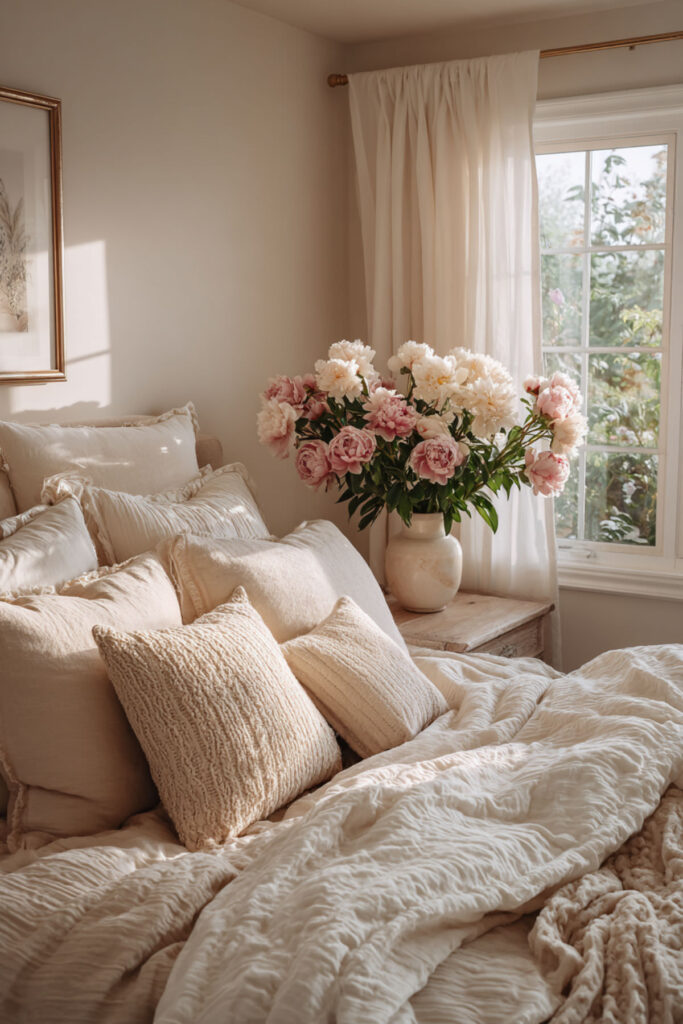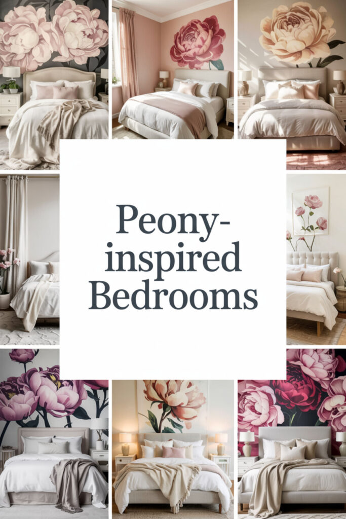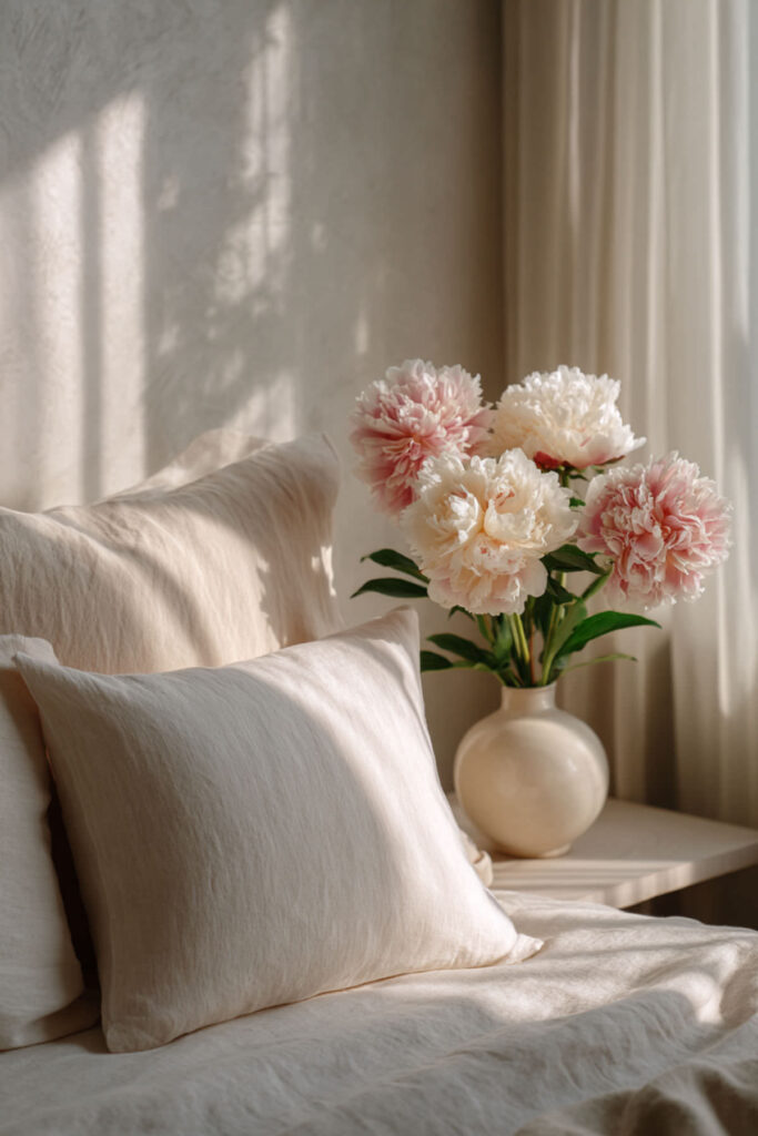 Develop elegant bedroom ideas inspired by peonies’ lush elegance. Choose bedding with watercolor peony prints in blush and cream, add silk peony arrangements, and select furniture with curved, petal-like lines.
