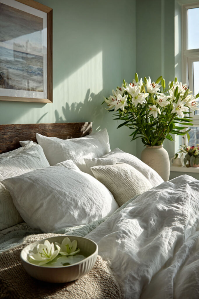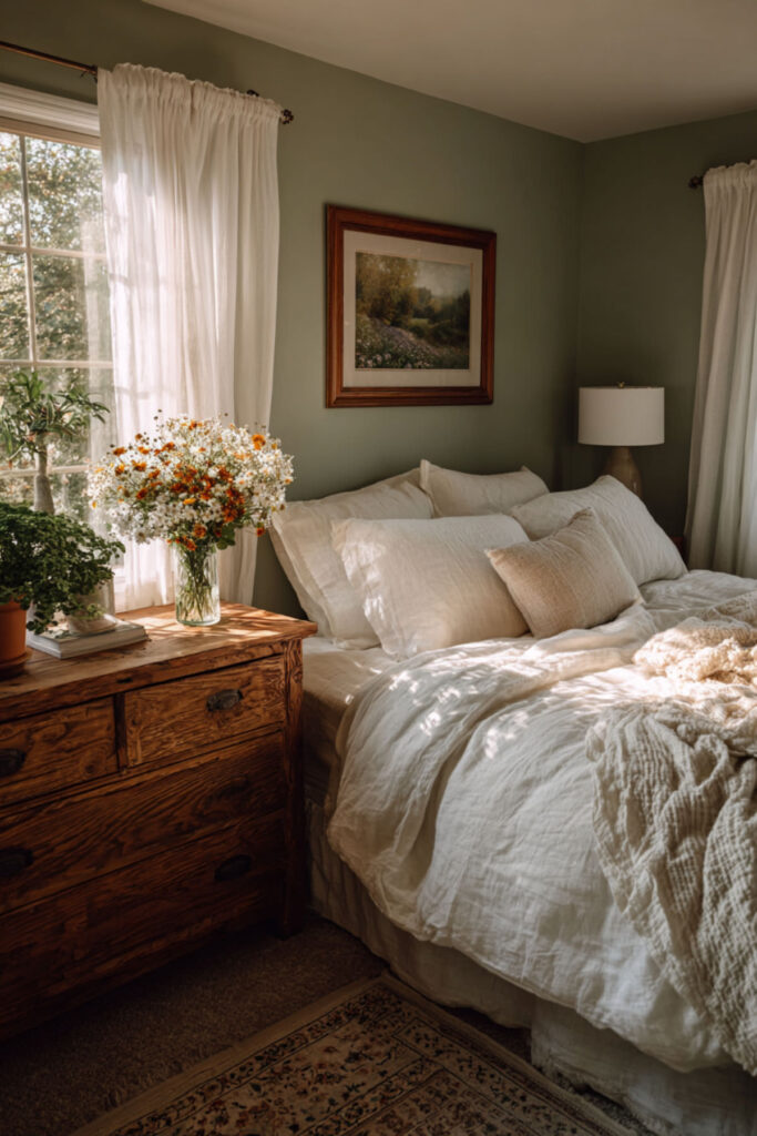 Create sage green bedroom ideas inspired by herb gardens for aromatic calm. Paint walls in soft sage and add botanical prints of healing herbs – lavender, chamomile, rosemary. The green provides visual rest while herb imagery suggests healing. This garden approach connects to growth and renewal themes.