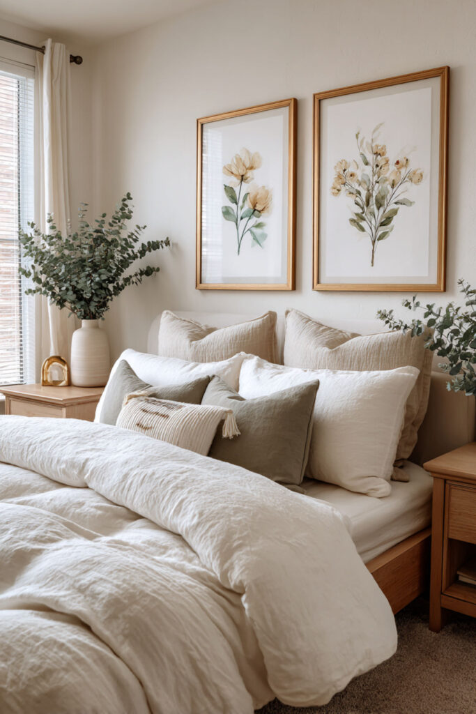 Design soothing bedroom ideas cozy as wildflower meadows through thoughtful layering. Combine cream walls with bedding featuring tiny scattered florals in muted lavender, sage, and butter yellow. This meadow approach provides variety without chaos – crucial when your life feels overwhelming.