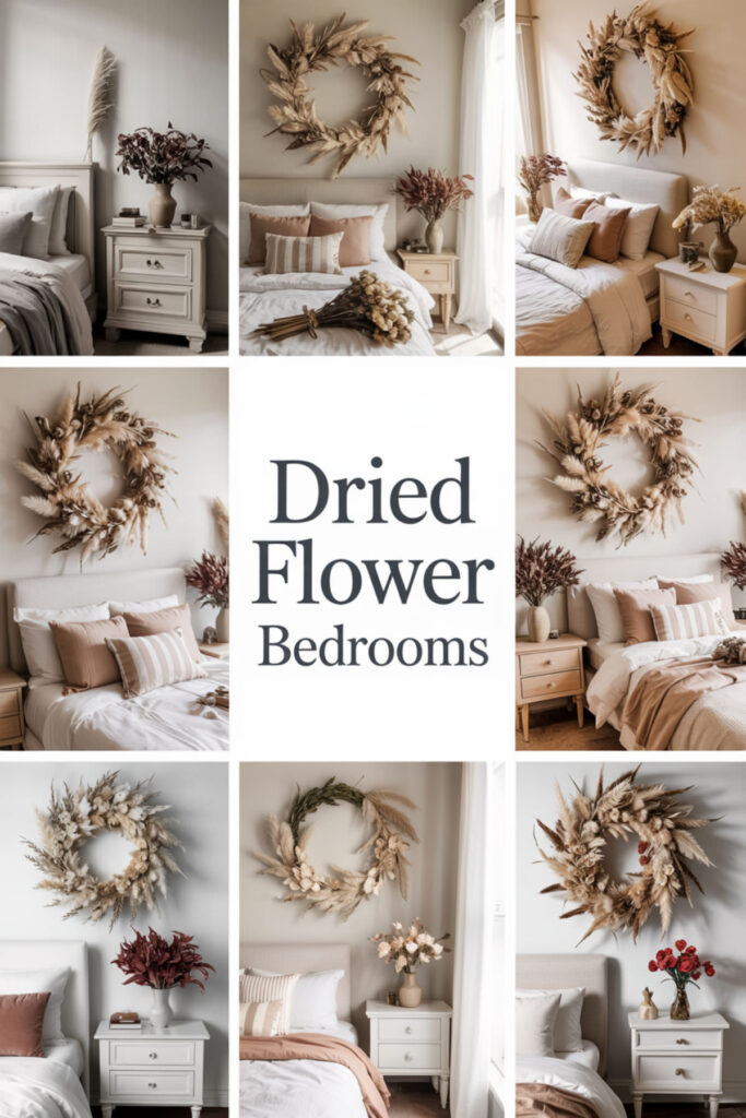 Design a neutral coloured bedroom enhanced with dried flower accents for lasting beauty. Incorporate dried lavender bundles, pampas grass in tall vases, and preserved eucalyptus. Dried flowers provide texture and subtle color without maintenance or mess.