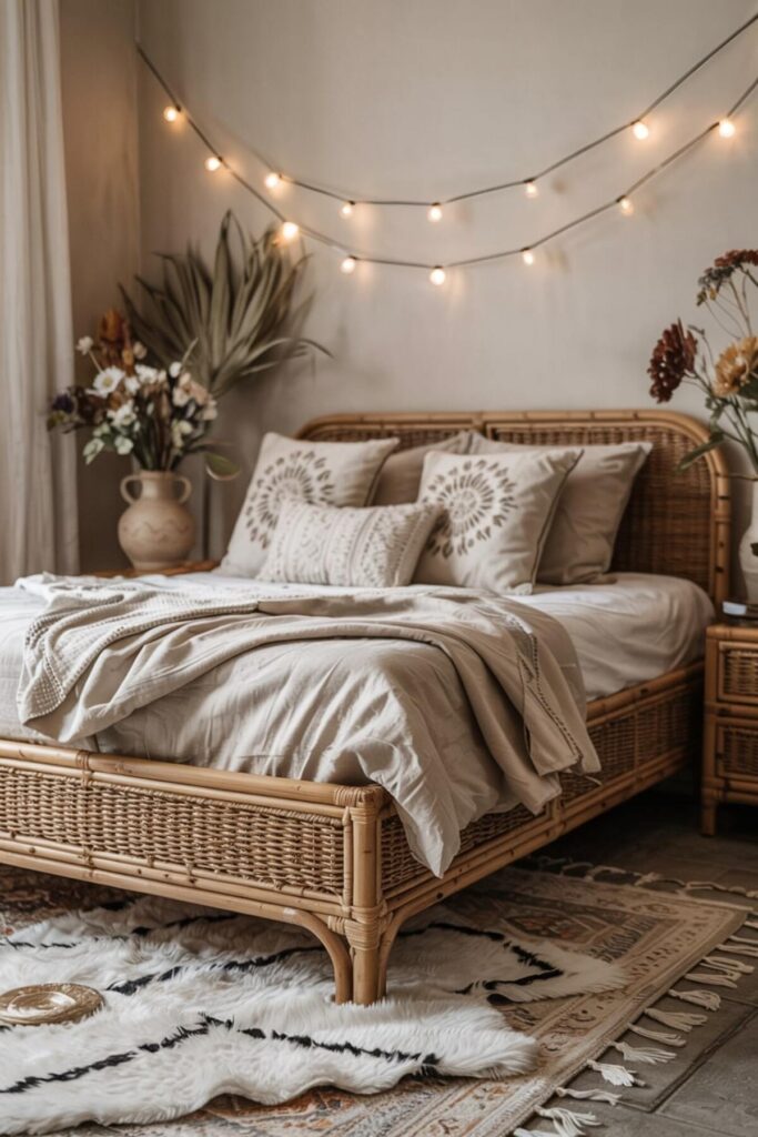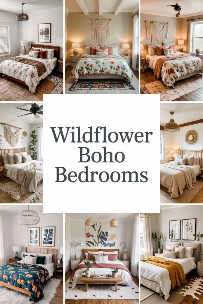 Create boho bedroom ideas celebrating wildflower freedom through unstudied arrangement. You can mix different floral patterns in similar color families, add vintage botanical books, and display collected flowers in mismatched vases.