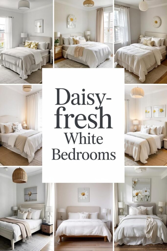 Develop white bedroom ideas inspired by daisies’ simple freshness. Choose all-white bedding with subtle daisy embroidery, add white furniture, and include just touches of yellow. A white spindle-leg nightstand keeps the look light and classic while offering practical storage. The daisy inspiration brings cheerfulness without complexity.