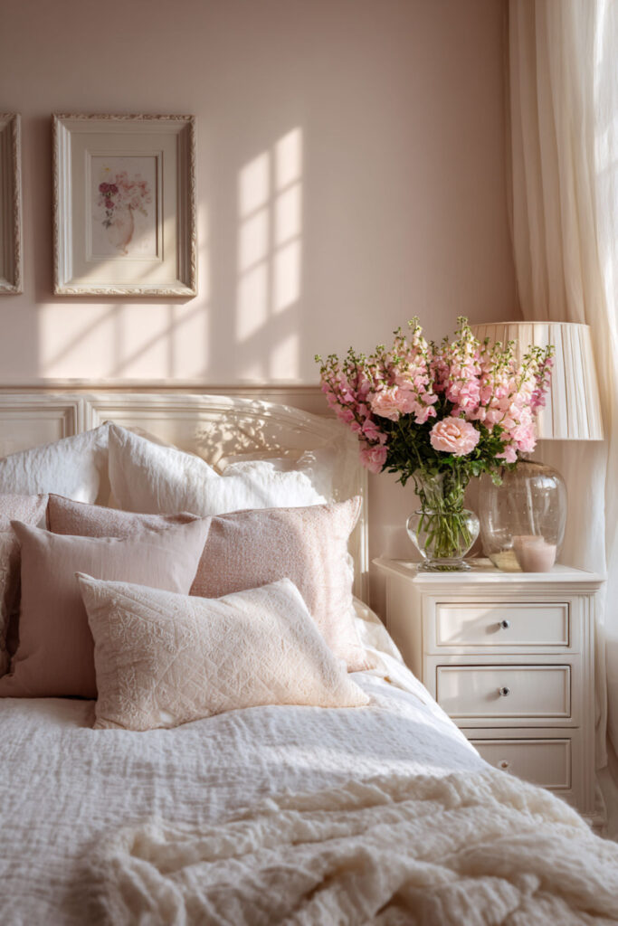 A blush pink upholstered headboard enhances the soft floral aesthetic and creates a cozy focal point. The colors whisper rather than shout, perfect for overstimulated new mom nerves. Floral inspiration doesn’t require bold blooms. I really recommend starting with petal-inspired neutrals. Would you believe soft pink walls could make night feedings feel gentler? Since painting petal pink, your bedroom feels like being held by spring.