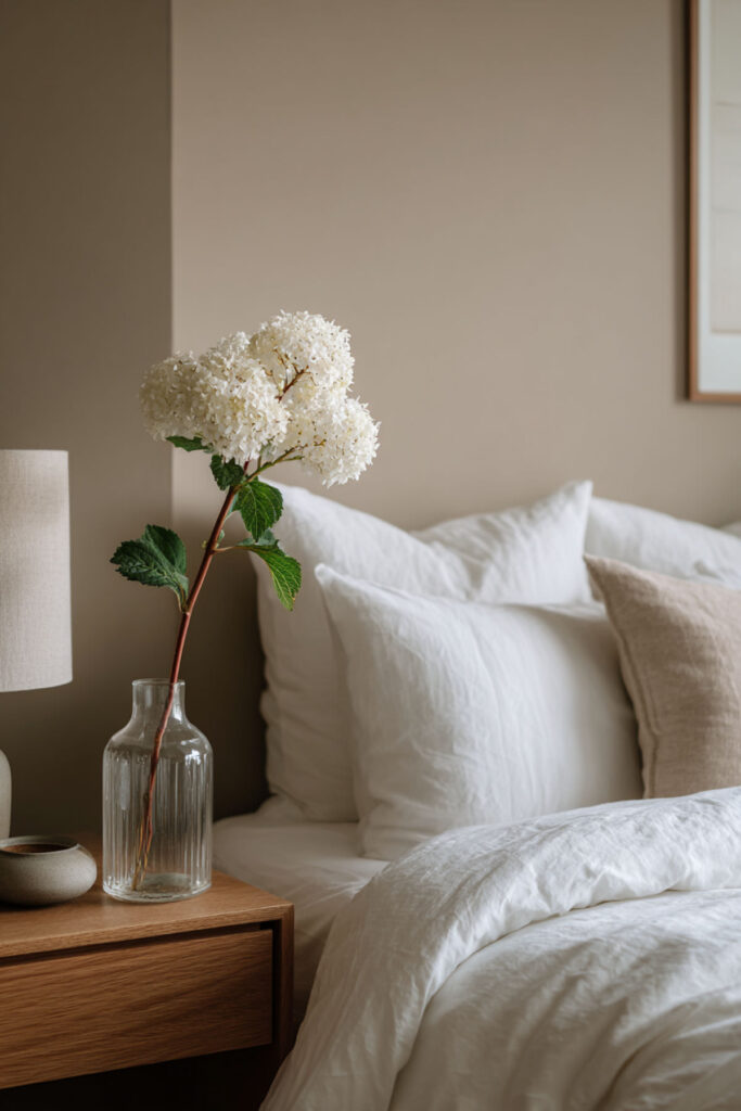 Apply minimalist bedroom ideas through single stem floral focus. Place one perfect peony in a simple glass vase, making it the room’s only decorative element. A sleek white floating shelf offers the ideal display spot for the single flower without cluttering the visual field.