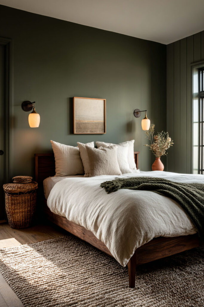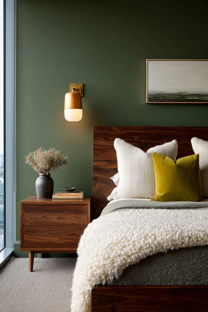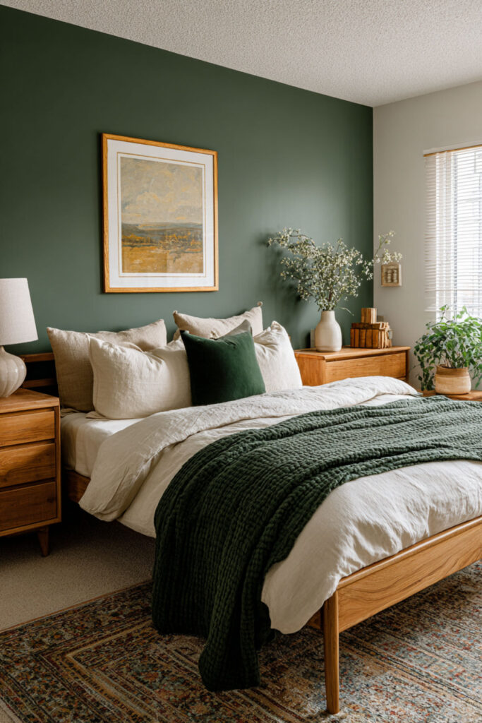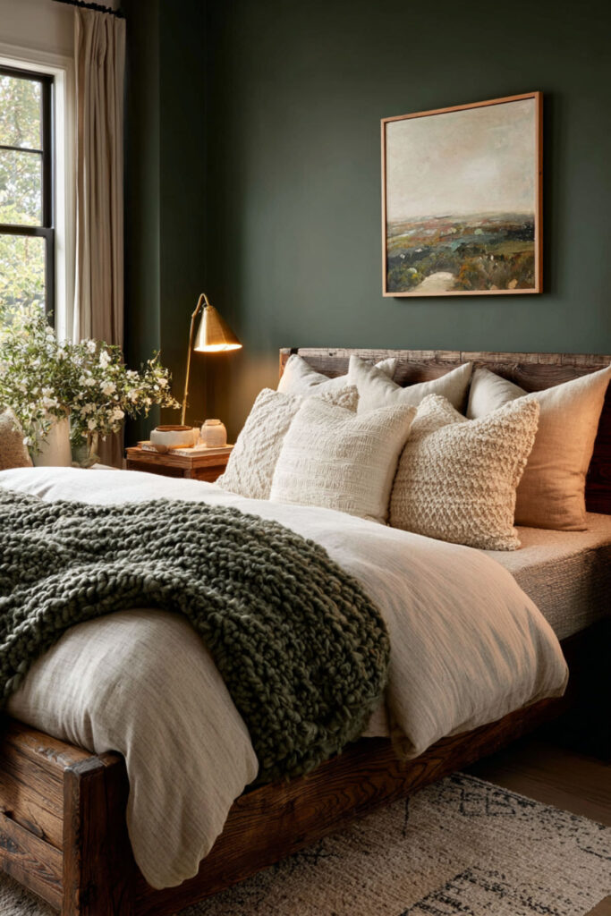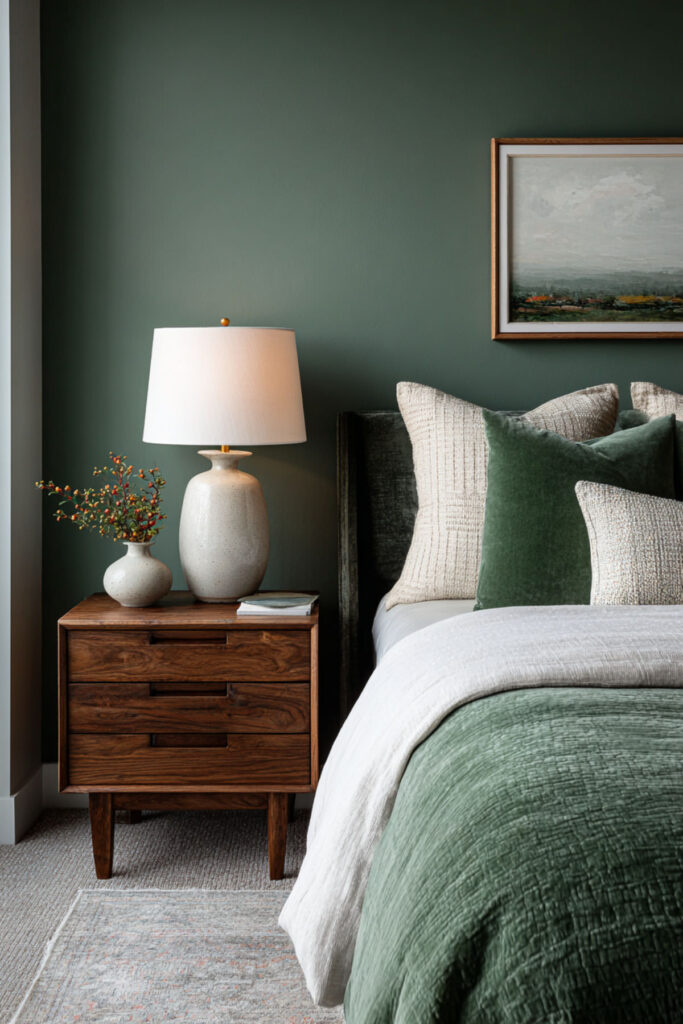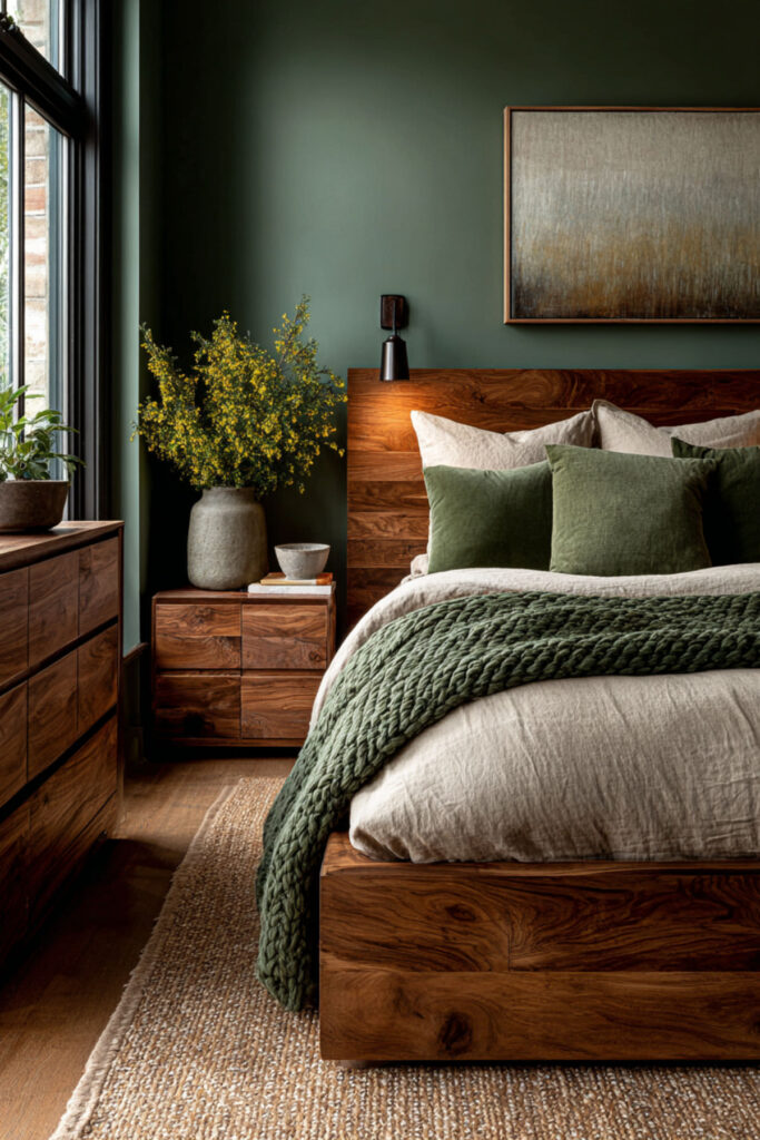 Walnut is the natural wood that pairs most richly with forest green. Its deep, reddish-brown tones carry enough warmth to counterbalance the green’s coolness, and its pronounced grain pattern adds organic visual texture without introducing pattern through fabric. A walnut bed frame, nightstands, and dresser against forest green walls create a palette that feels like earth and canopy — the forest from the ground up. This is furniture that ages beautifully (walnut darkens and deepens over time), which resonates with the midlife philosophy of choosing things that get better rather than things that need replacing. I recommend warm walnut furniture (bed frame, nightstands, dresser) with visible grain and simple, clean lines. Brass hardware on the dresser connects the wood to the metal accent palette. This bedroom paint ideas earth tones and warm earthy paint tones idea grounds the room in the same material philosophy the entire bedroom is built on: quality, permanence, and beauty that deepens with time.