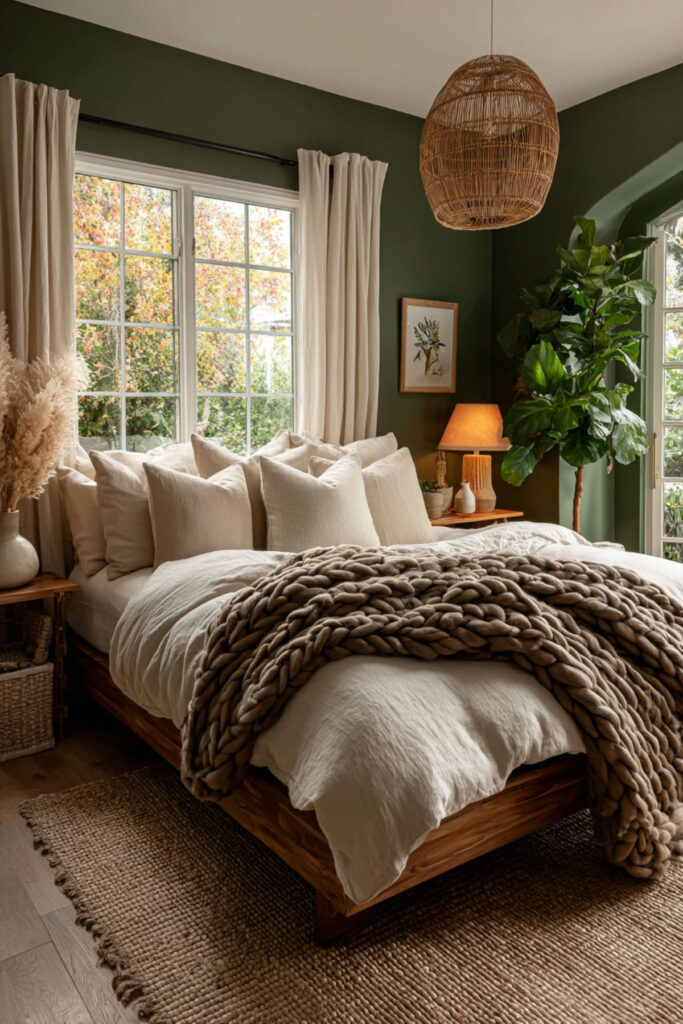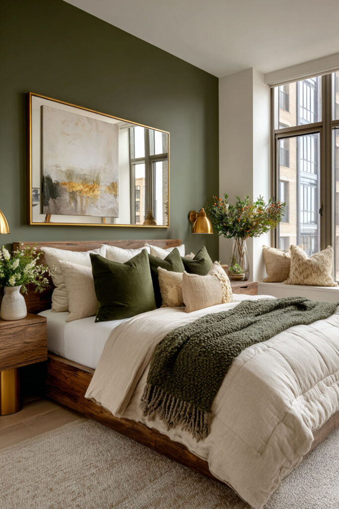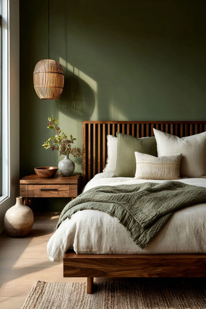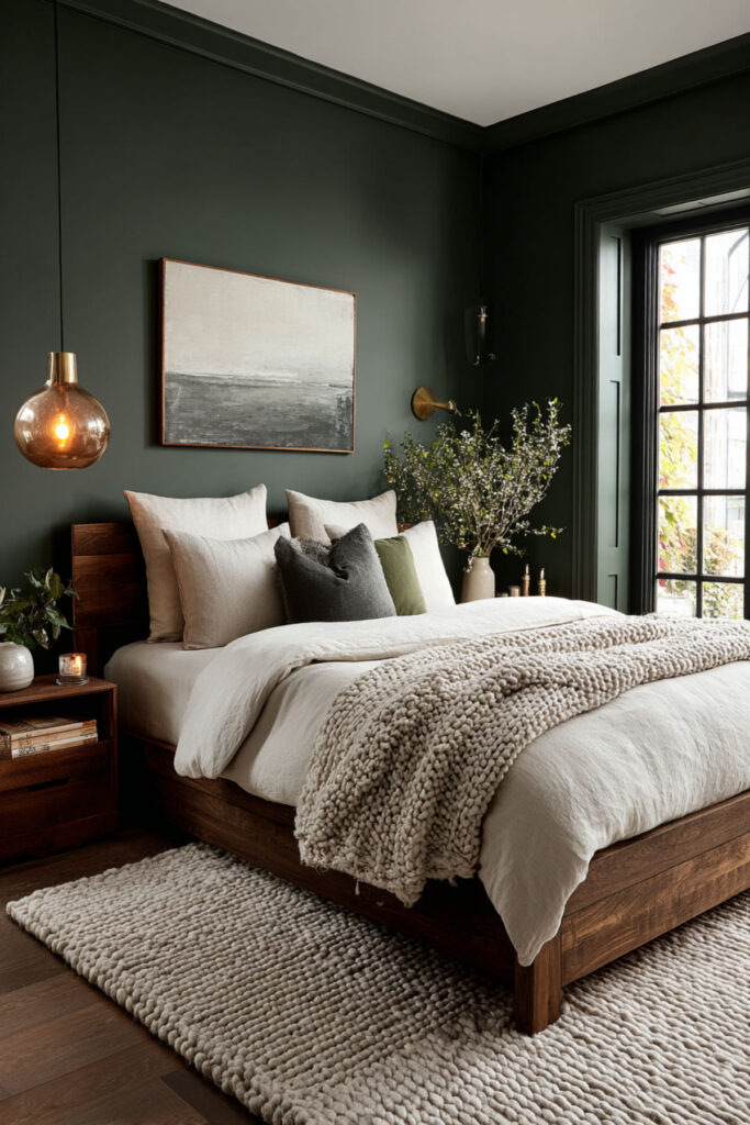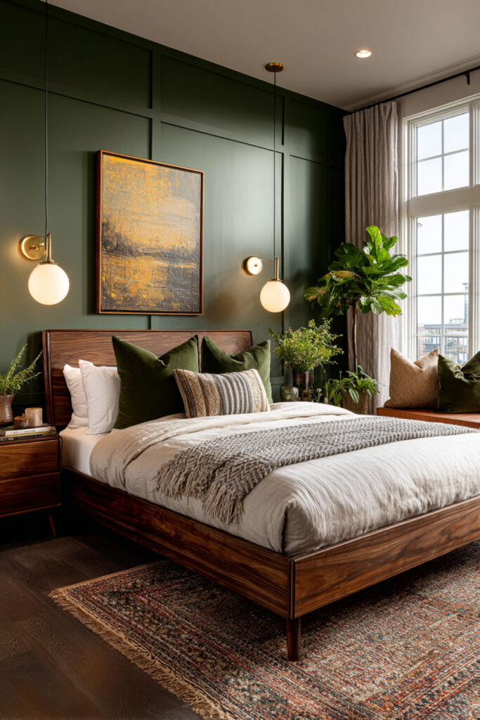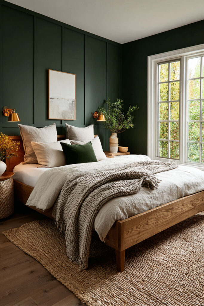 Walnut is the natural wood that pairs most richly with forest green. Its deep, reddish-brown tones carry enough warmth to counterbalance the green’s coolness, and its pronounced grain pattern adds organic visual texture without introducing pattern through fabric. A walnut bed frame, nightstands, and dresser against forest green walls create a palette that feels like earth and canopy — the forest from the ground up. This is furniture that ages beautifully (walnut darkens and deepens over time), which resonates with the midlife philosophy of choosing things that get better rather than things that need replacing. I recommend warm walnut furniture (bed frame, nightstands, dresser) with visible grain and simple, clean lines. Brass hardware on the dresser connects the wood to the metal accent palette. This bedroom paint ideas earth tones and warm earthy paint tones idea grounds the room in the same material philosophy the entire bedroom is built on: quality, permanence, and beauty that deepens with time.