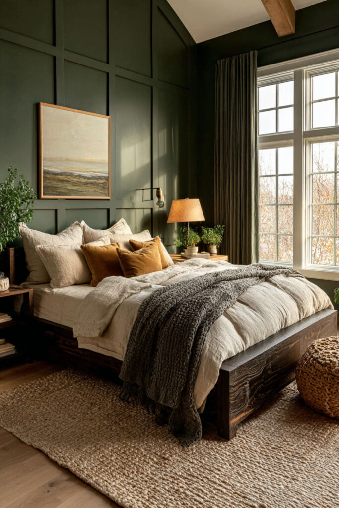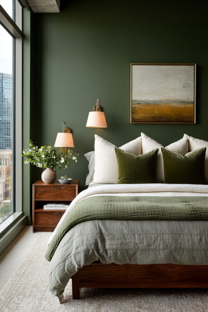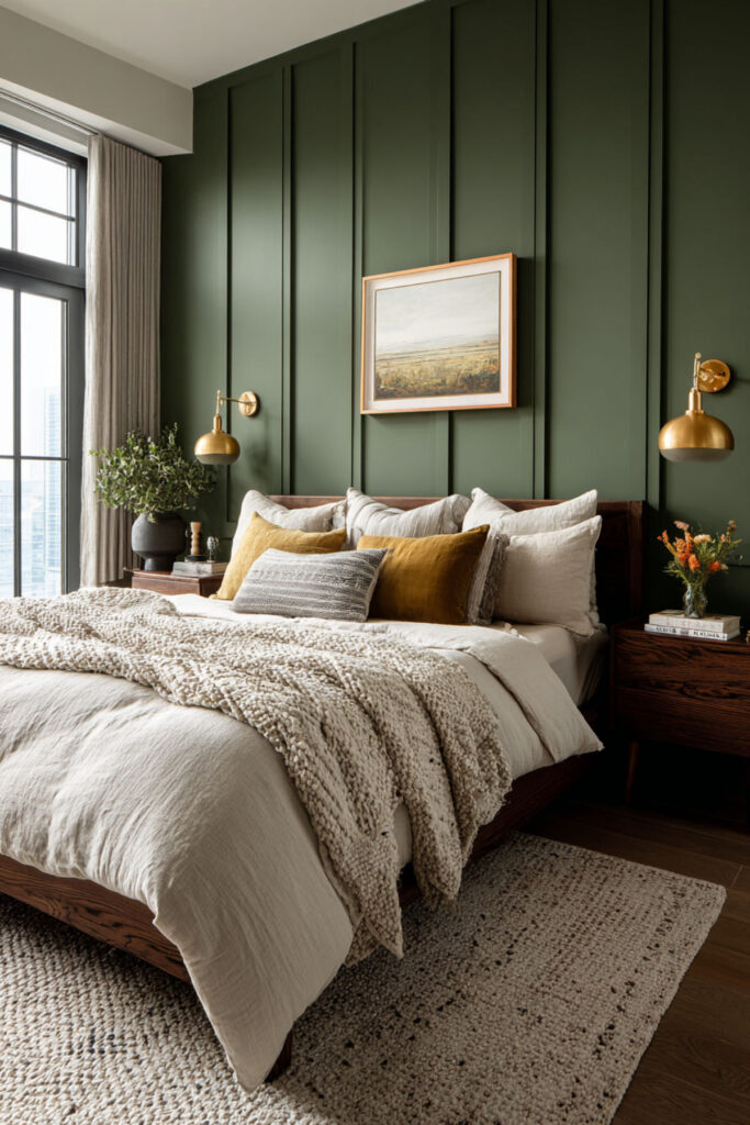 Painting all four walls in deep forest green transforms a bedroom from a room with a color into a room that is a color. The walls become an environment — absorptive, enveloping, warm in the way a library is warm or a forest clearing at dusk is warm. Deep green absorbs light rather than reflecting it, which means the room naturally dims in the evening and glows amber when warm lamps are on. Cream bedding radiates against it. Brass catches fire against it. Everything in the room improves. I recommend deep forest green interior wall paint in matte finish on all four walls. Matte is essential — it absorbs light softly and prevents the painted-box effect that satin or semi-gloss can create. This dark green bedroom paint colors and earthy bedroom idea is the most committed, most transformative, most deeply comforting version of a forest green bedroom — total immersion in the color your body finds most restful.