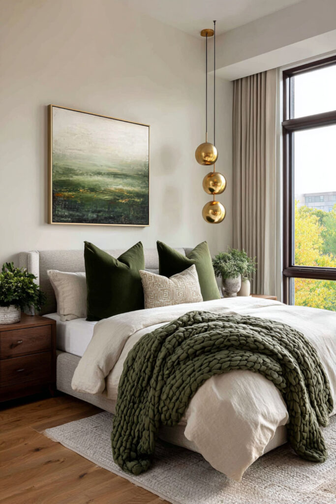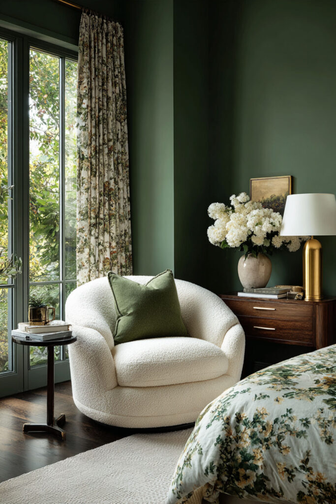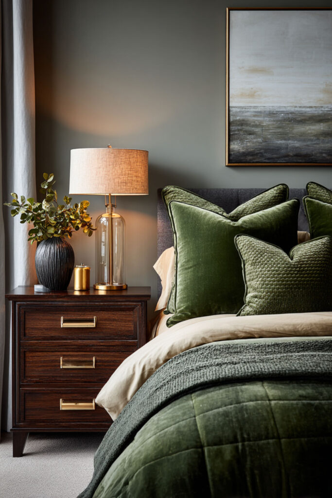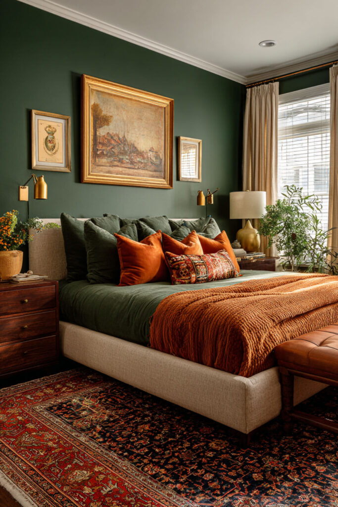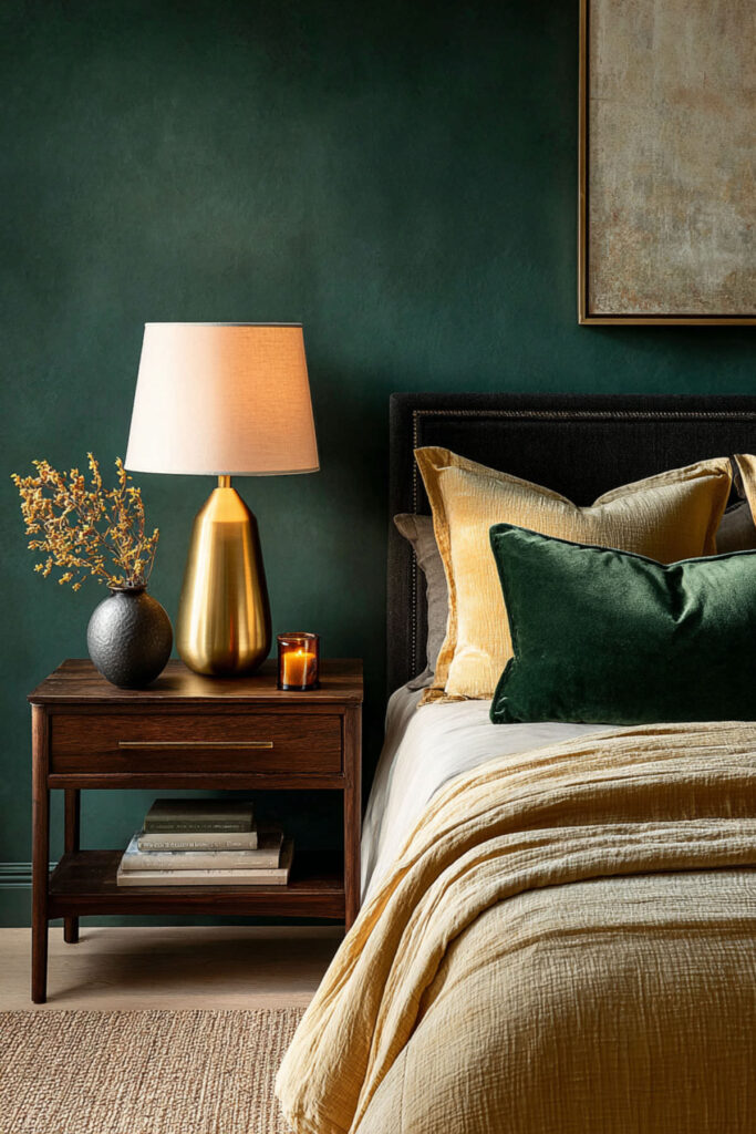 Brass lamps on nightstands are not decorative accessories in a forest green bedroom — they’re essential. Brass against forest green creates one of the richest visual pairings in interior design: the warm gold tone of the metal catches and amplifies warm light, creating pools of amber glow against the deep green walls that feel like candlelight or firelight. The effect at night is genuinely stunning — the room goes from “painted green” to “glowing from within.” I recommend matching brass table lamps with cream or ivory linen shades and warm 2700K LED bulbs on both nightstands, separately switched so one partner can read while the other sleeps. This luxury bedroom paint colors and warm bedroom colors idea adds the metallic warmth that makes forest green feel luxurious rather than dark — the single accessory that activates the entire palette.