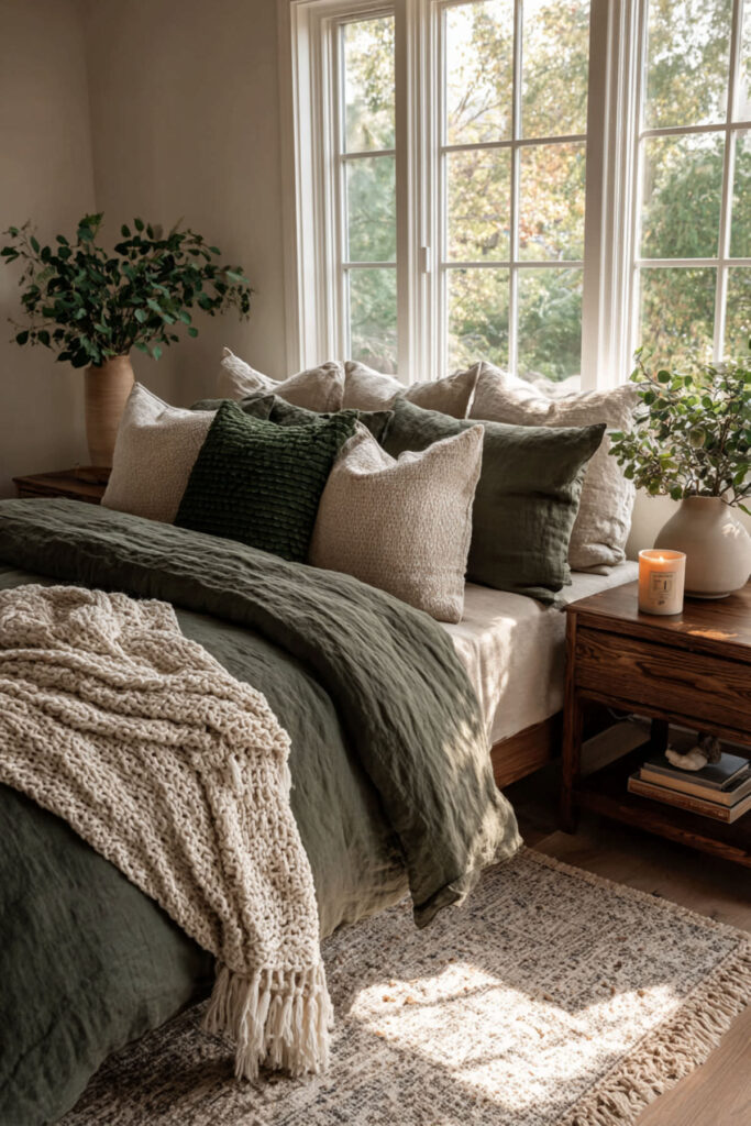 Velvet in a forest green bedroom adds a dimension that no other textile can: it changes shade depending on how light hits it, creating a living texture that shifts between light and dark green across a single surface. A velvet throw pillow, a velvet blanket at the foot of the bed, or (the most impactful version) a velvet upholstered headboard in deep forest green or rich emerald introduces the tactile luxury that midlife comfort should include. You’ve earned textures that feel as good as they look. I recommend one to three velvet pieces in forest green, emerald, or deep teal: throw pillows, a throw blanket, or an upholstered headboard. The velvet should be in the green family to create tonal depth, not contrast. This soothing bedroom colors and relaxing bedroom colors idea adds the one textile that makes a forest green room feel genuinely rich — not just colored, but textured, layered, and luxurious.
