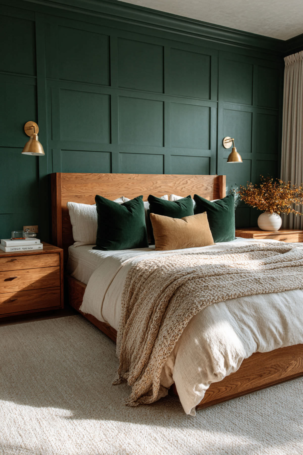 Walnut is the natural wood that pairs most richly with forest green. Its deep, reddish-brown tones carry enough warmth to counterbalance the green’s coolness, and its pronounced grain pattern adds organic visual texture without introducing pattern through fabric. A walnut bed frame, nightstands, and dresser against forest green walls create a palette that feels like earth and canopy — the forest from the ground up. This is furniture that ages beautifully (walnut darkens and deepens over time), which resonates with the midlife philosophy of choosing things that get better rather than things that need replacing. I recommend warm walnut furniture (bed frame, nightstands, dresser) with visible grain and simple, clean lines. Brass hardware on the dresser connects the wood to the metal accent palette. This bedroom paint ideas earth tones and warm earthy paint tones idea grounds the room in the same material philosophy the entire bedroom is built on: quality, permanence, and beauty that deepens with time.