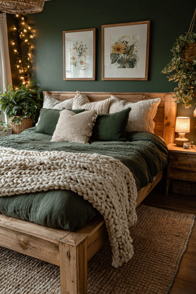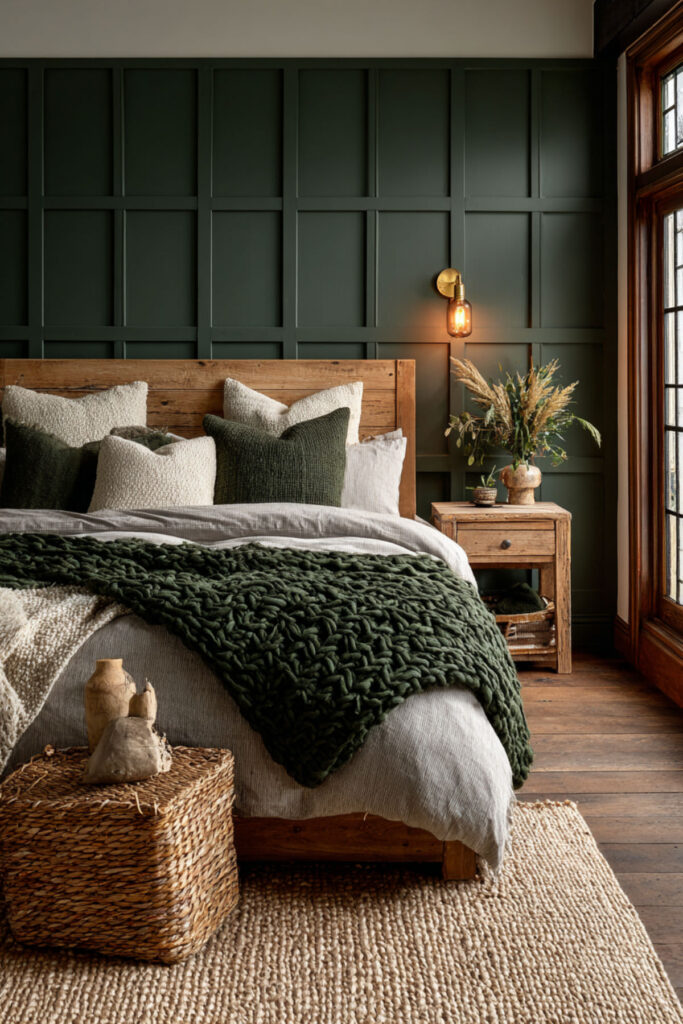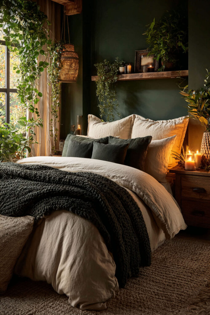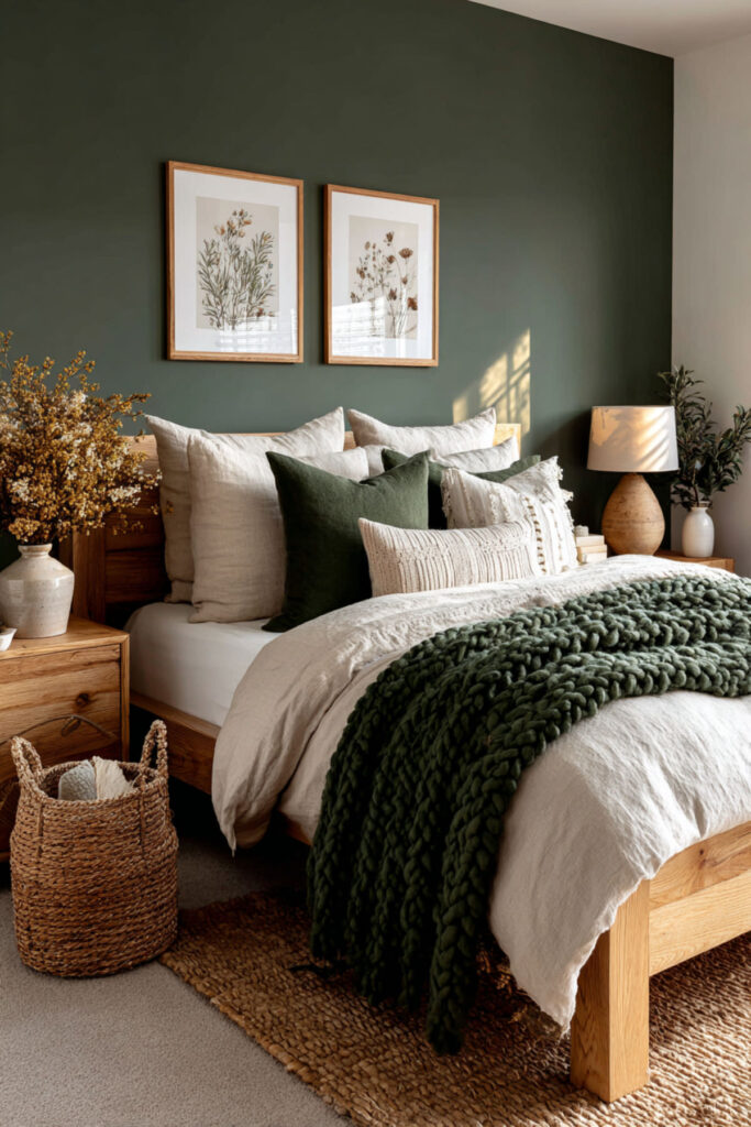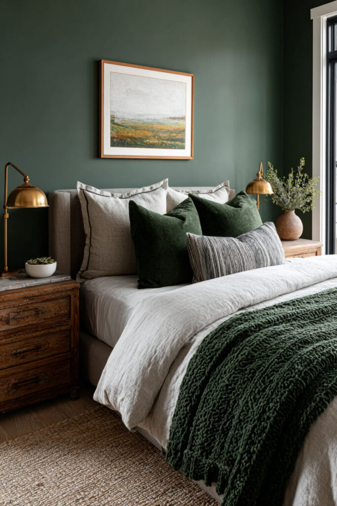 This is where the magic really happens for screen-free evenings. When your bed feels impossibly good, you don’t need a phone to keep you company. A forest green duvet or comforter layered with beige linen throws and cream pillows creates this cocooning effect that just wraps around you. I highly recommend a heavyweight cotton or linen forest green comforter — something with actual weight to it that makes you feel held. Layer a chunky knit throw at the foot of the bed in a warm oatmeal tone. The green bedding against neutral sheets gives you that forest green and cream bedroom palette without having to touch a paintbrush. It’s the easiest entry point for anyone testing the forest green bedding bedroom ideas trend.